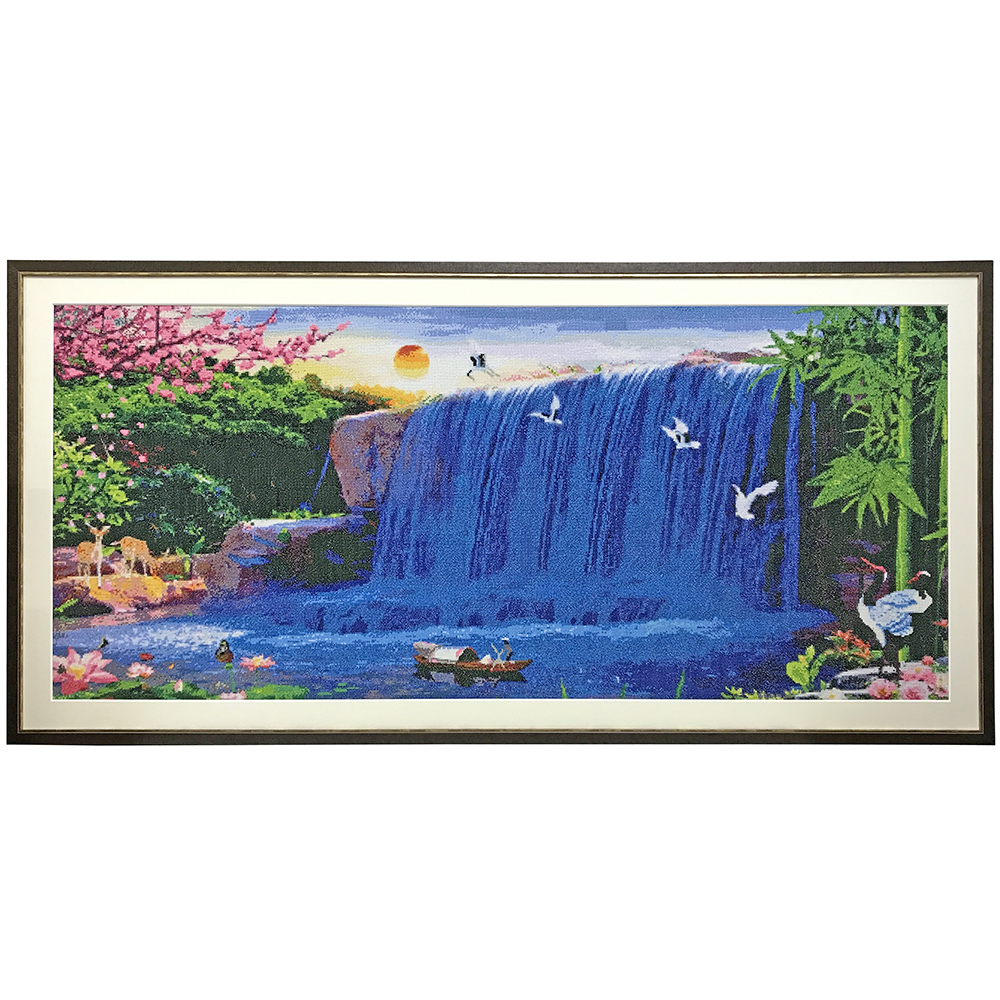 中国で盛んに作られている、クロスステッチキットを使った刺繍作品の額装です。風水を重視する中国らしく、縁起物のモチーフが散りばめられた図案に人気があるようです。こちら[夢の滝]といった名称で販売されているようですが、日の出、鶴、滝、桜など、お部屋に飾ると家全体にご利益がありそうな作品になっています。