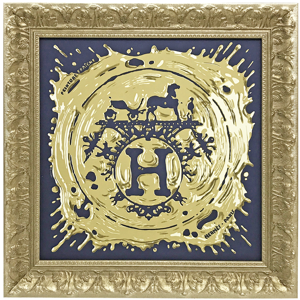 ガヴロッシュ45「ペンキ塗りたて」の額装です。「ペンキ塗りたて」は、サイズも色も様々なバリエーションが発表されているエルメスのカレ。こちらは40cm程度のプチカレですが、重厚感溢れるフレームでインパクトのある仕上がりになりました。