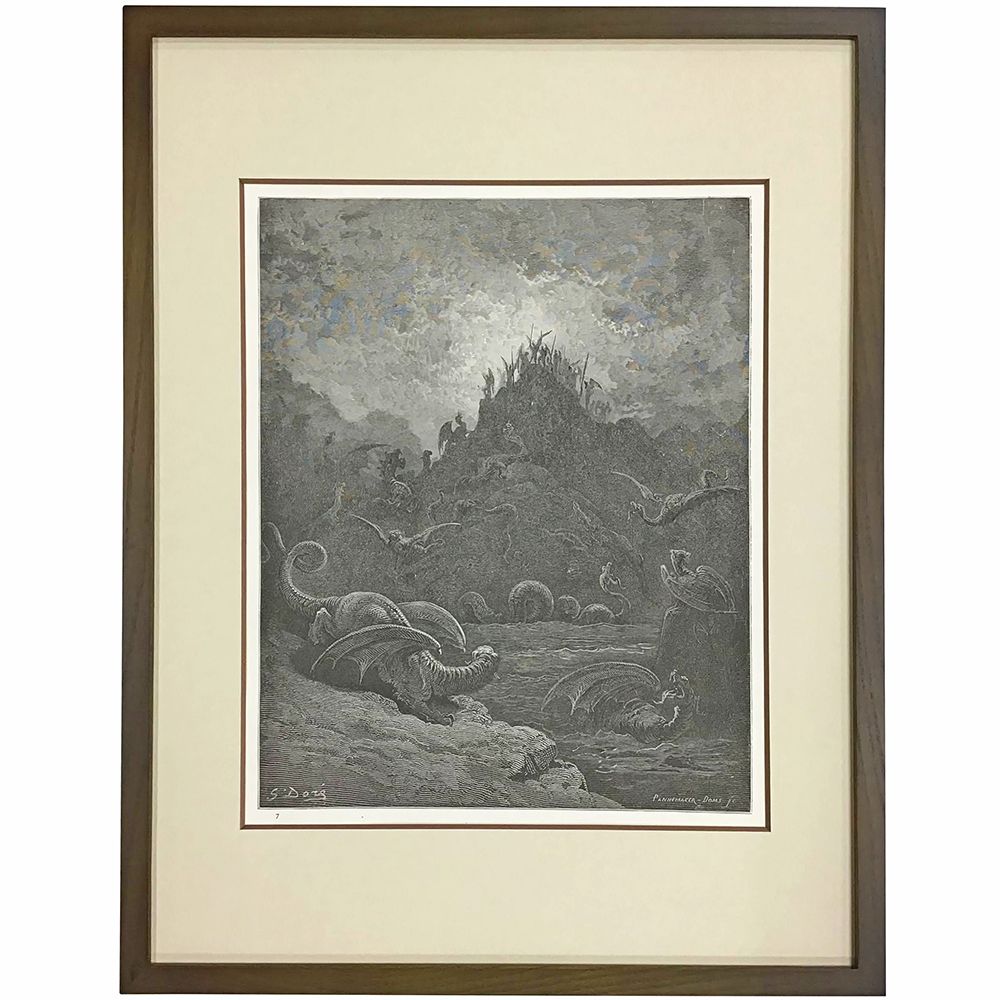 描かれているのは、地獄に落とされた天使たちを描いたジョン・ミルトンの文学作品『失楽園』のワンシーンとのことです。天使たちが反逆の狼煙を上げる決起の瞬間のように見えますし、わびしい地獄をさまよい歩いているシーンともとれます。地を這う怪物達は神話などに登場するゴルゴン、ヒドラ、キメラ達。この作品の中では黒々と個々の表情がわからないまま描かれており、一層不気味さが増しています。