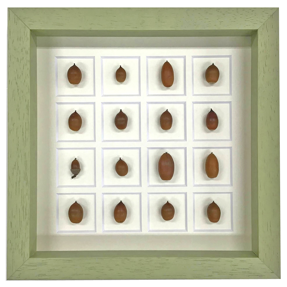 大きさ20センチ角の中に拾い集めた小さなドングリを額装しました。ドングリはお子さんと公園で拾い集めたものとのことです。経験のある方は、ピカピカのドングリを拾い集め、大切におうちに持って帰り、ある日袋を覗いてみるとコロコロとした生き物が・・・となってしまった事もあるかもしれません。こちらは消毒した上十分乾燥させてあるとの事でした。もちろん処理をしたドングリを額装する分には問題はありませんが、慎重な下ごしらえが必要です。