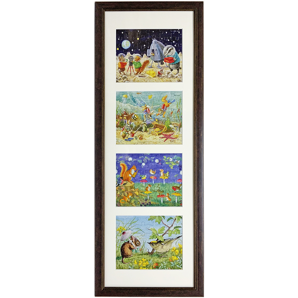 今回は4つのパズルを1つの額縁に飾るために、マットを4窓加工して額装しました。かわいい絵柄のパズルですが、アンティーク調の額縁でとても雰囲気のいい仕上がりとなりました。