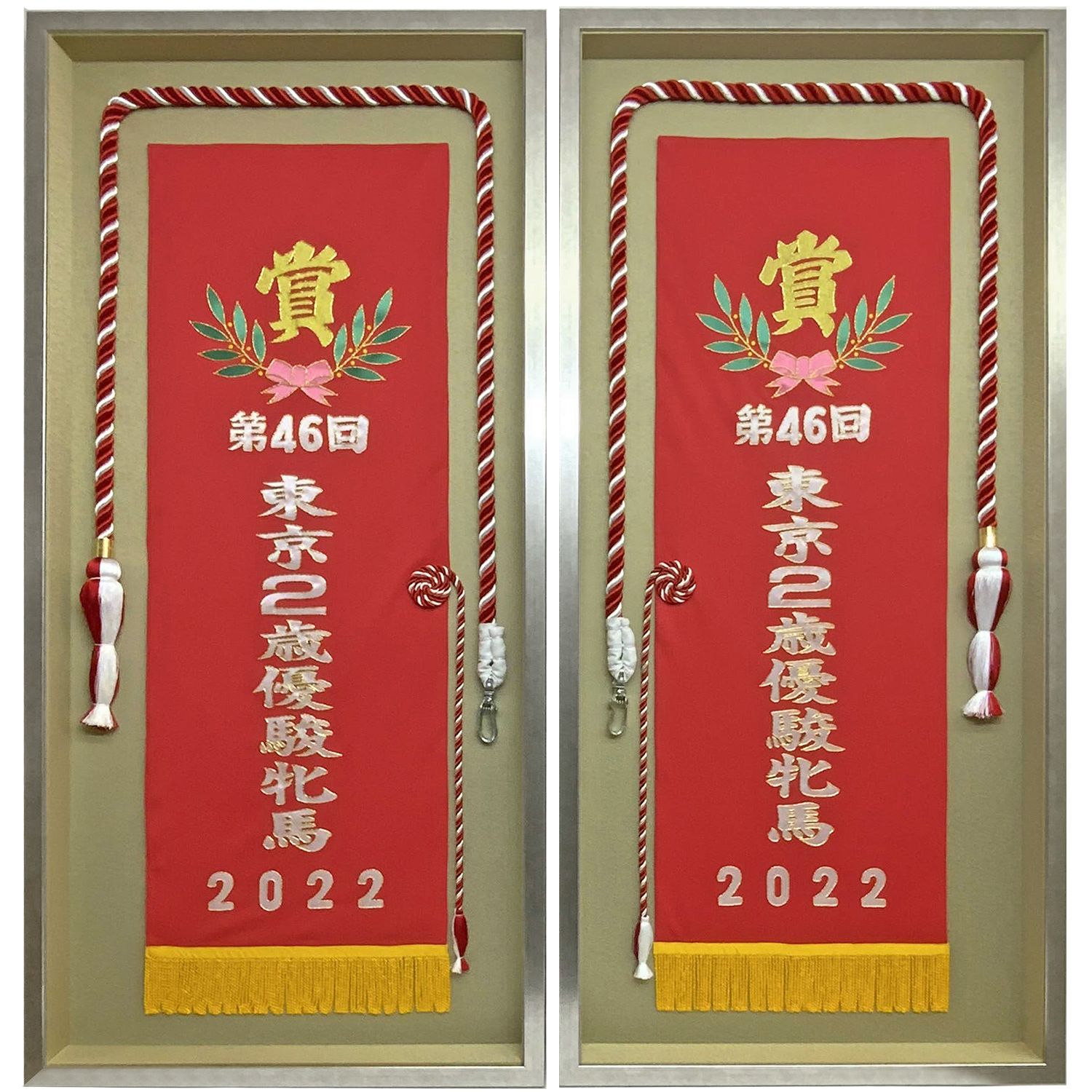 第46回東京2歳優駿牝馬のレースの優勝肩掛けと優勝綱の額装です。優勝馬の首から肩に掛ける肩掛けは、2枚重ねにして縫い付けることが多いのですが、今回は2枚に切り分けて二つの額縁に飾りました。ちょうど優勝手綱も2本あるので、同じ出来栄えの二つの額縁の完成です。裏表になった肩掛けなので、中央あたりに付いた首前で縛る紐が左右対称になりました。