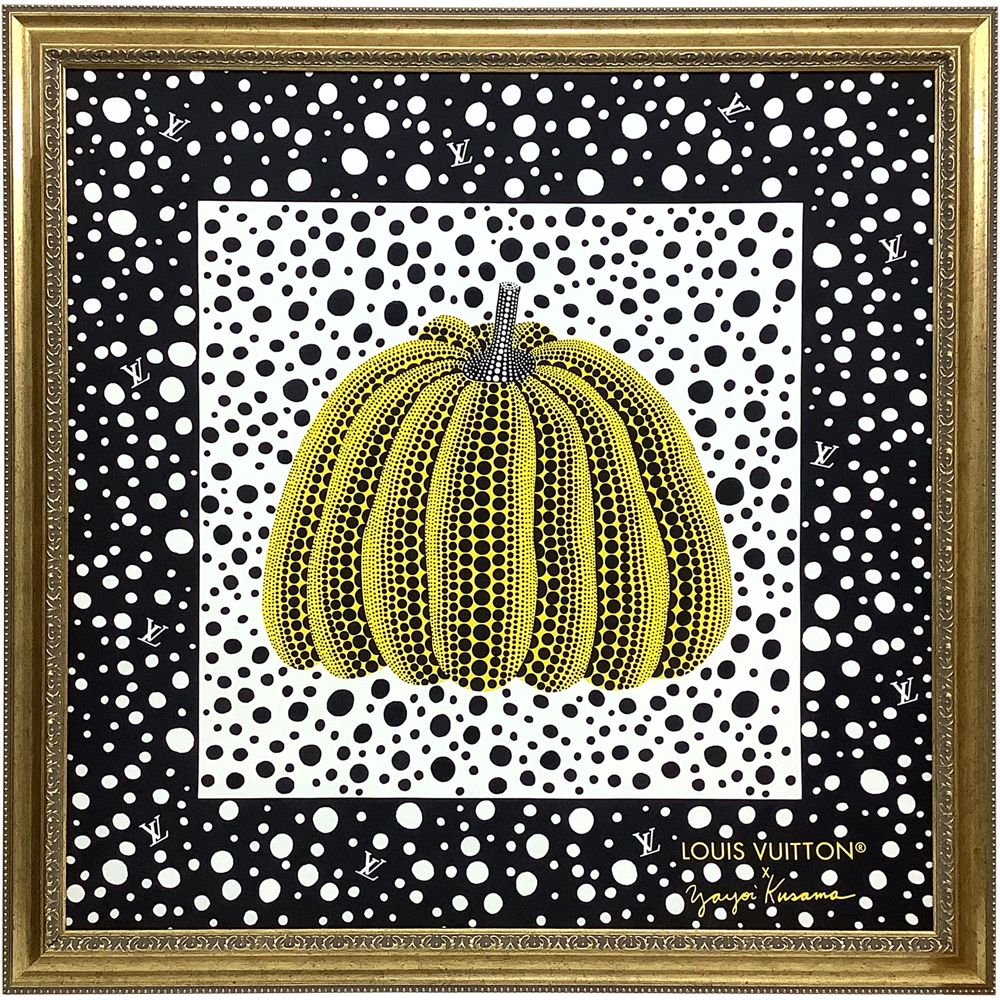 ルイヴィトン×草間彌生さんのコラボスカーフを額装しました。草間彌生さんの代表作ともいえる、かぼちゃのデザインが目を惹きます。カラーバリエーションもあり、こちらはシンプルなモノクロを基調としています。