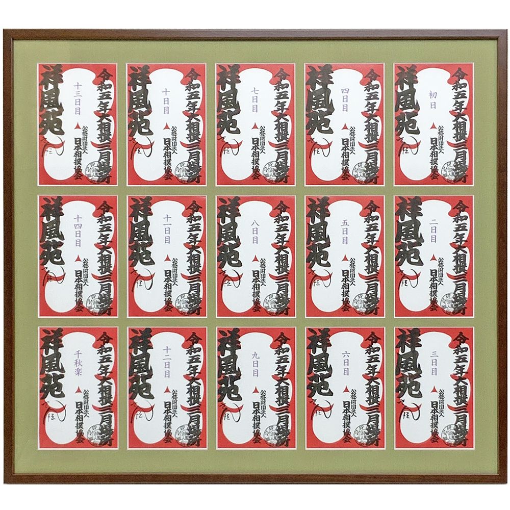 マット色は普通マットのカレハ色を選択。いわゆる鶯色っぽい色合いで、和風の品物にはぴったりのマットです。複数窓抜きの間隔をなるべく狭くして、コンパクトな仕上がりを心がけました。細身の木製フレームとの組み合わせで、15日分の額装でもすっきりとまとまっています。