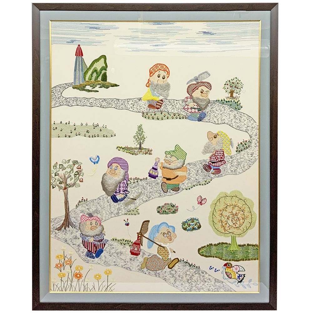 お母さまが丹精込めて制作された刺繍作品、娘さんが制作を引き継いで完成されました。85×110cmの大きさにもなる力作です。バリエーション豊かな小人の表情、牧歌的な雰囲気を醸し出す風景、全てを描き出す刺繍糸の一本一本に、丁寧さ、誠実さ、優しさが感じられます。
