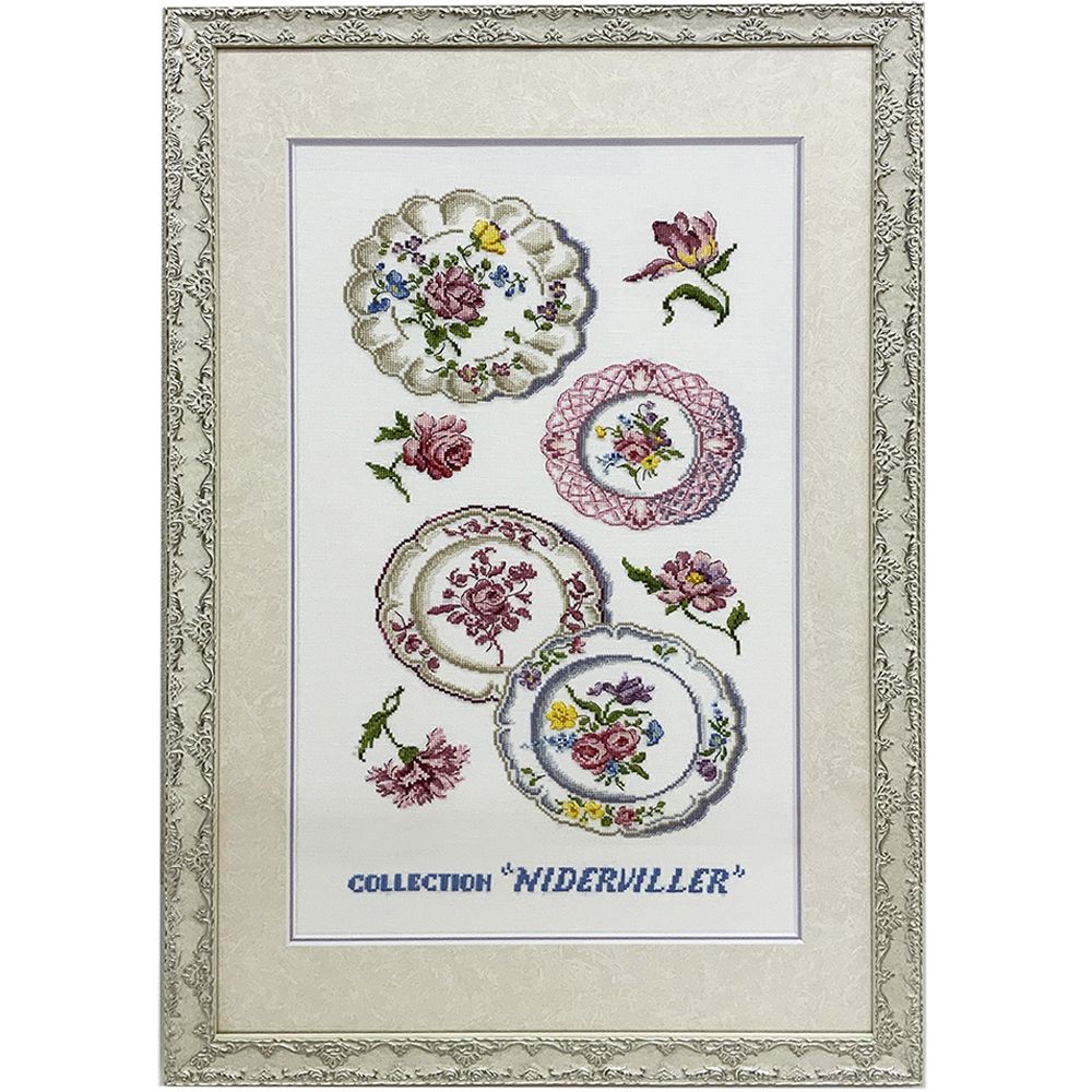 フランスの陶器メーカー、Niderviller社のアンティーク皿をモチーフにしたクロスステッチの額装です。グレーホワイトに、上品なシルバーが輝くフレームを選択しました。微妙な色合いが伝えきれないことに、もどかしさを感じてしまうフレームです。歴史あるアンティークなモチーフに、ぴったりのイメージに仕上がりました。