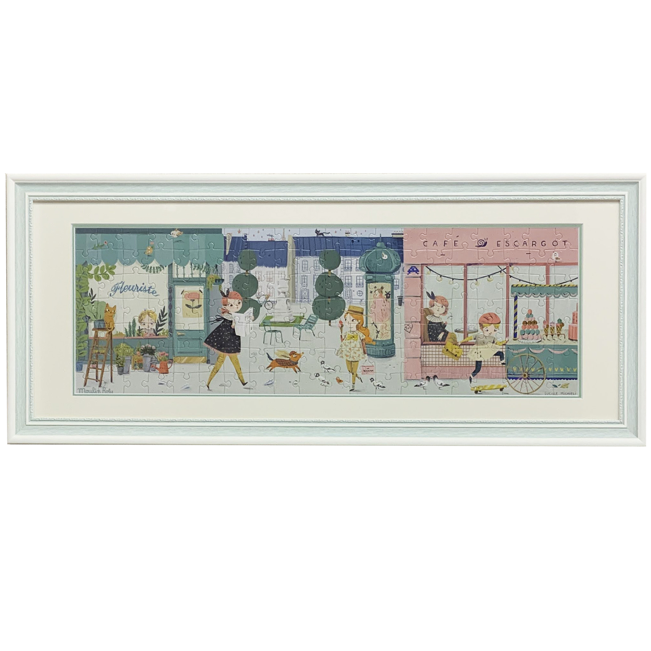 このパズルは「パリの街角」というタイトルですが、パリで暮らす女の子たちの日常を切り取った絵柄になっており、とても明るい色合いのパズルです。「SF350 ブルー」というフレームを使用し、額装マットもワーグマン10043と若竹10764のダブルマットにしたことで、パズルの雰囲気と合ったとてもかわいい仕上がりの額装となりました。既製額ではなかなかこういった雰囲気のフレームがないので、特注製作ならではの見栄えになったのではないでしょうか。