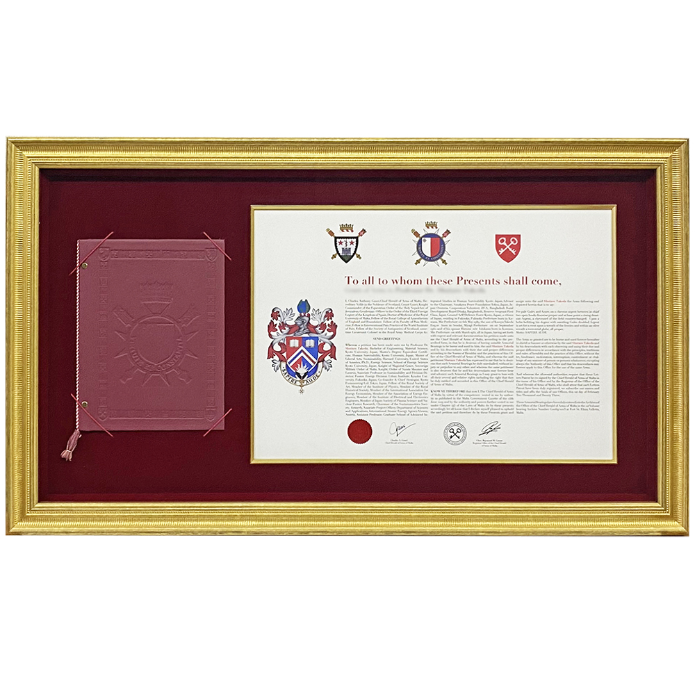 功績が綴じられた革のバインダーと、大きめの表彰状をセットで飾りたいというご希望です。ゴールドのフレームととスエード赤の組み合わせで、華々しい功績にふさわしい額装になりました。
