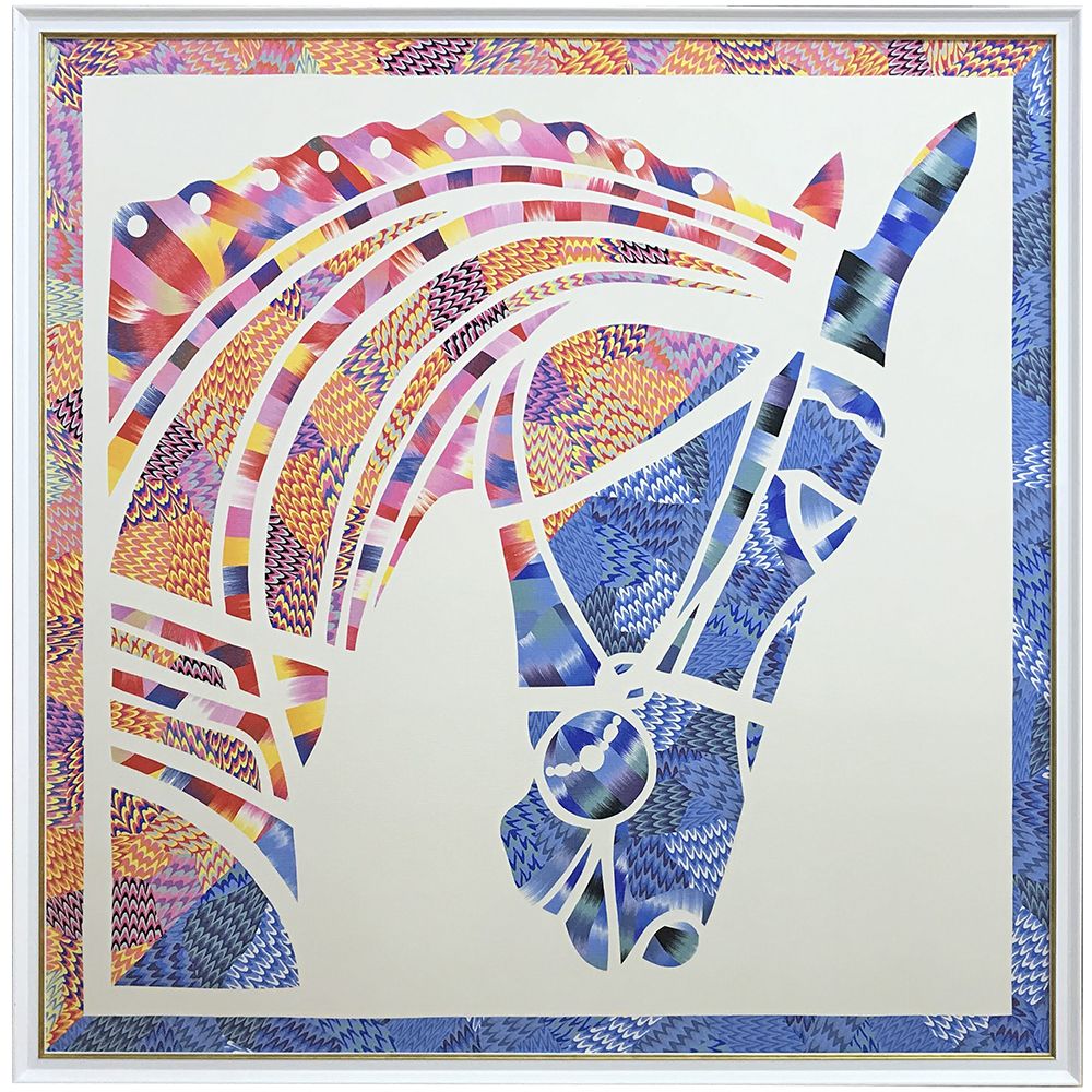 フランス語でイブニングドレスを意味する「Robe Du Soir(ローブ デュ ソワール)」と題された、ピンクとブルーのコントラストが美しいスカーフです。細部をよく見るとかなり奇抜な色遣いになっているものの、全体的に調和が取れていて華やかなデザインに思えます。