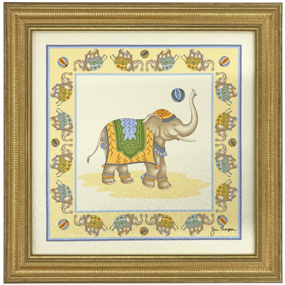 タイシルクの代名詞、ジムトンプソンのミニスカーフの額装です。ジムトンプソンのスカーフは、どれもタイの文化や自然を反映した独創的なデザイン。象は古くからタイの人々と共に暮らし、戦争や農業、祭りなどに活躍してきました。ジムトンプソンのデザインにおいても、当然のごとく最もポピュラーなモチーフとなっています。