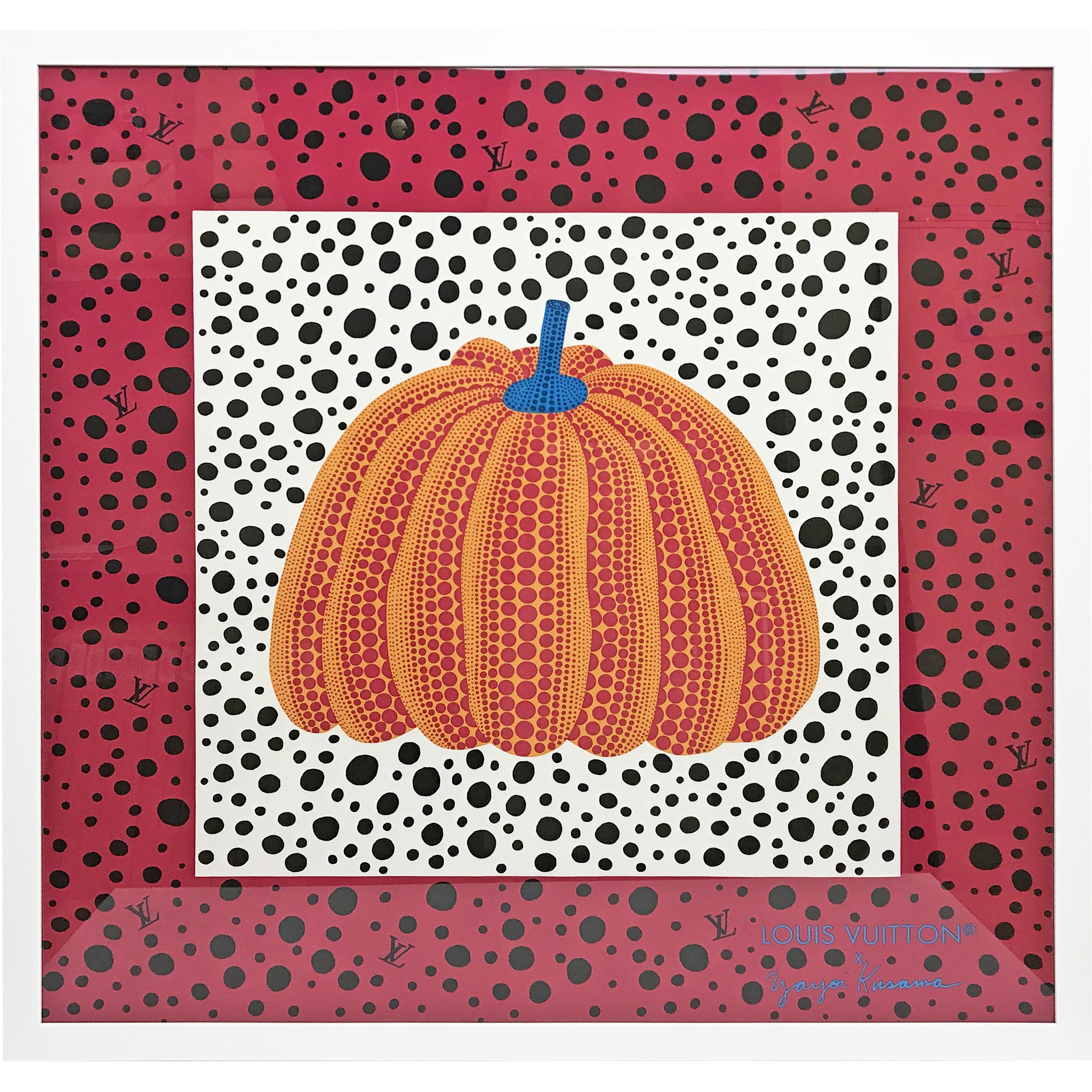 「ルイ・ヴィトン × 草間彌生」コレクションの1つ「LV × YK カレ90・パンプキン」の額装です。草間彌生さんの作品はいずれも人気がありますが、こちらのスカーフは特に入手が困難。ルイ・ヴィトンの公式サイトで7万円ほどで販売されていますが、草間彌生さんの作品を手に入れると考えれば7万円も安いもの。人気が集中するのも頷けます。運よく手に入れられたならば、是非とも飾って自慢しましょう。