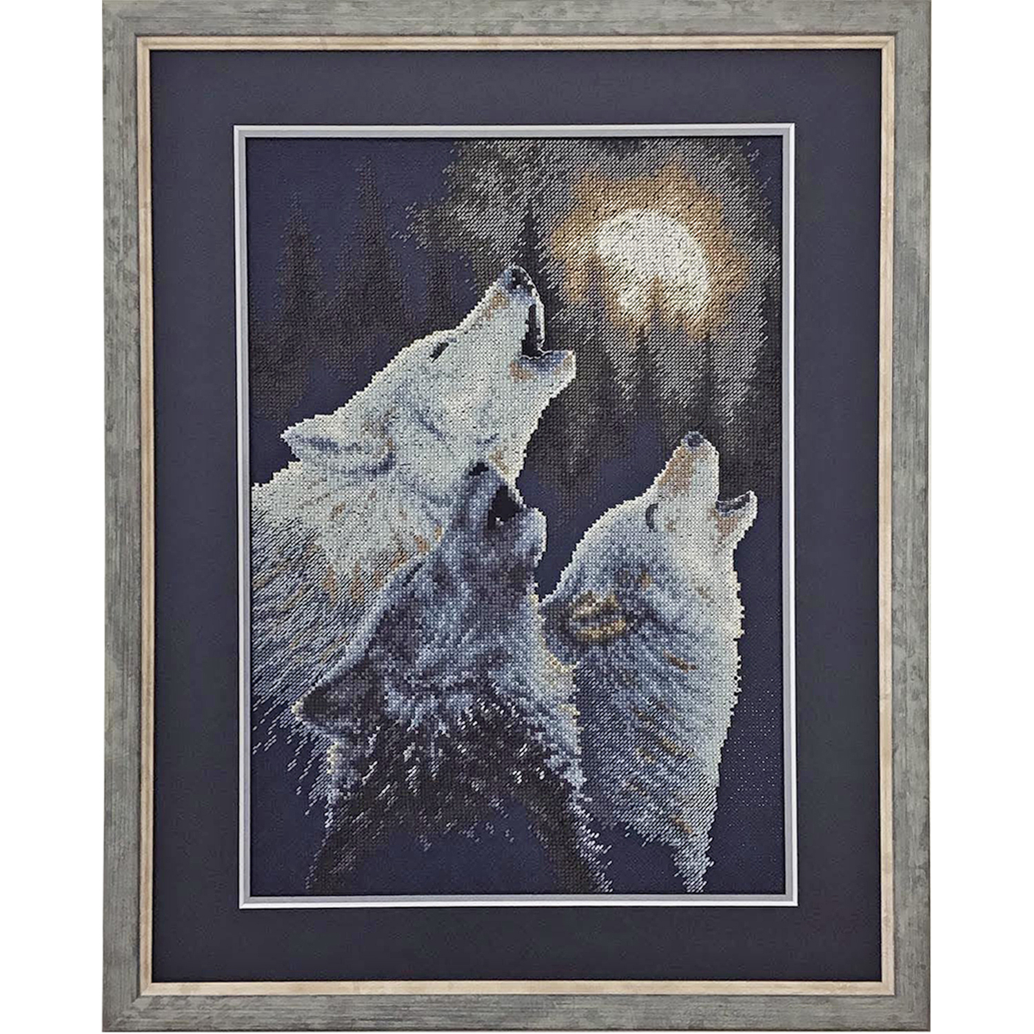 狼の遠吠えのクロスステッチ刺繍を額装しました。皆とても気持ちよさそうな表情です。動物や人の表情を刺繍の中で付けるのはとても難しそうです!こちらのクロスステッチ刺繍はゲージ自体も細かく、お客さまも狼の表情は細部を工夫して製作をされたとのことでした。作品のベースの布の色は深い紺色、狼の色は白系と、コントラストがはっきりついている上、狼の毛並みのグラデーションが細かく付いているので、写真のような精細さを感じます。