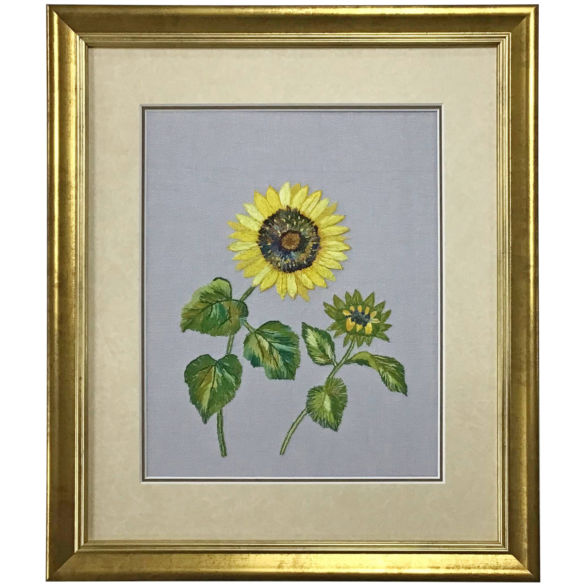 今回はダブルマットを使用して額装を行いました。作品自体が明るい色だけではなく、ところどころ変化している花びらや葉の色を、糸を細かく使い分けて表現されていましたので、ひまわりの種の色に近い落ち着いた上ブラウンのマットを差し色に使って全体的な色の雰囲気をまとめてみました。