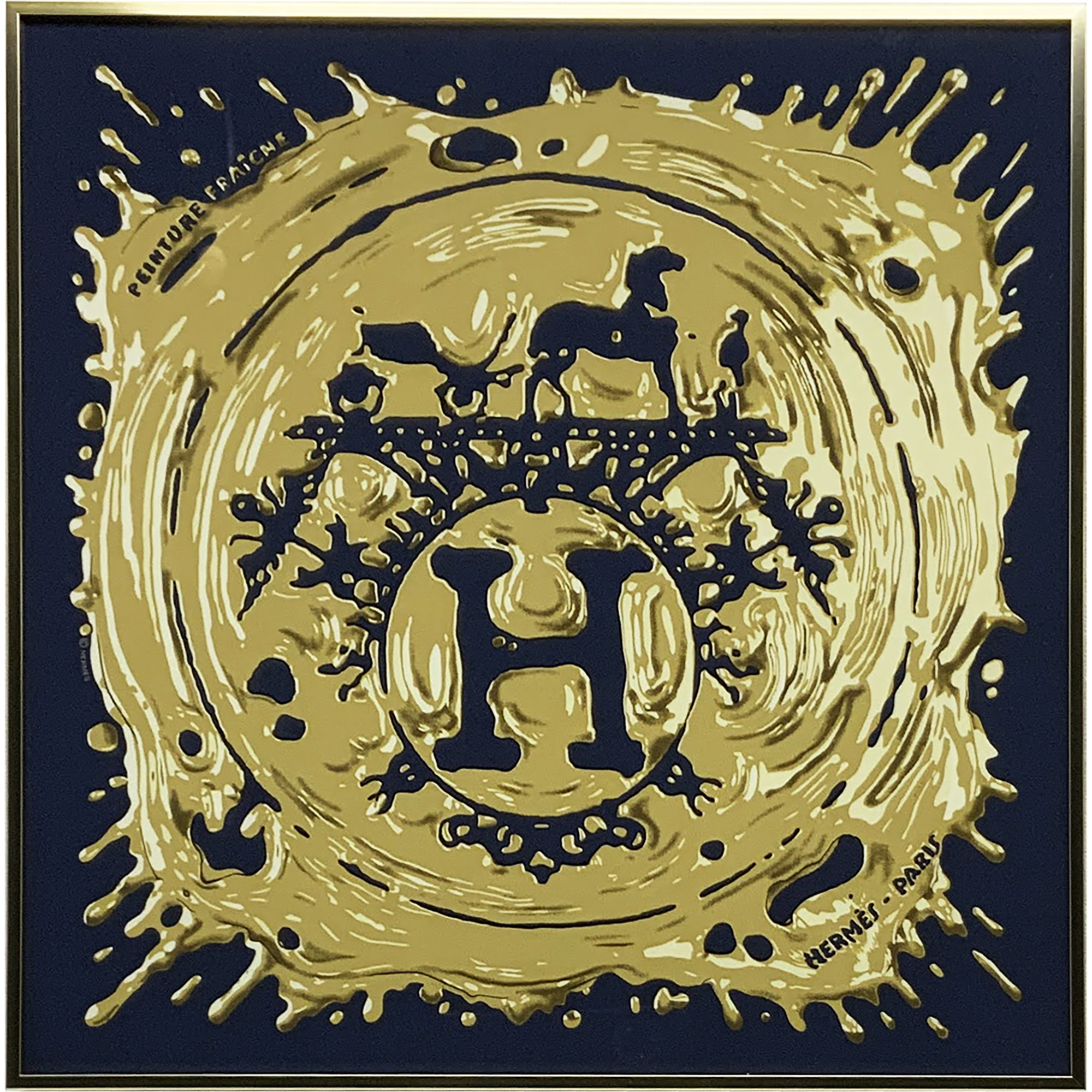 豪快に跳ねたインクのデザインが特徴的な、エルメスの「ペンキ塗りたて」を額装しました。45センチ程度の小ぶりなサイズです。「ペンキ塗りたて」はカラーバリエーションも豊富ですが、今回は黒地に金の色合いがシンプルながらインパクトを与えます。