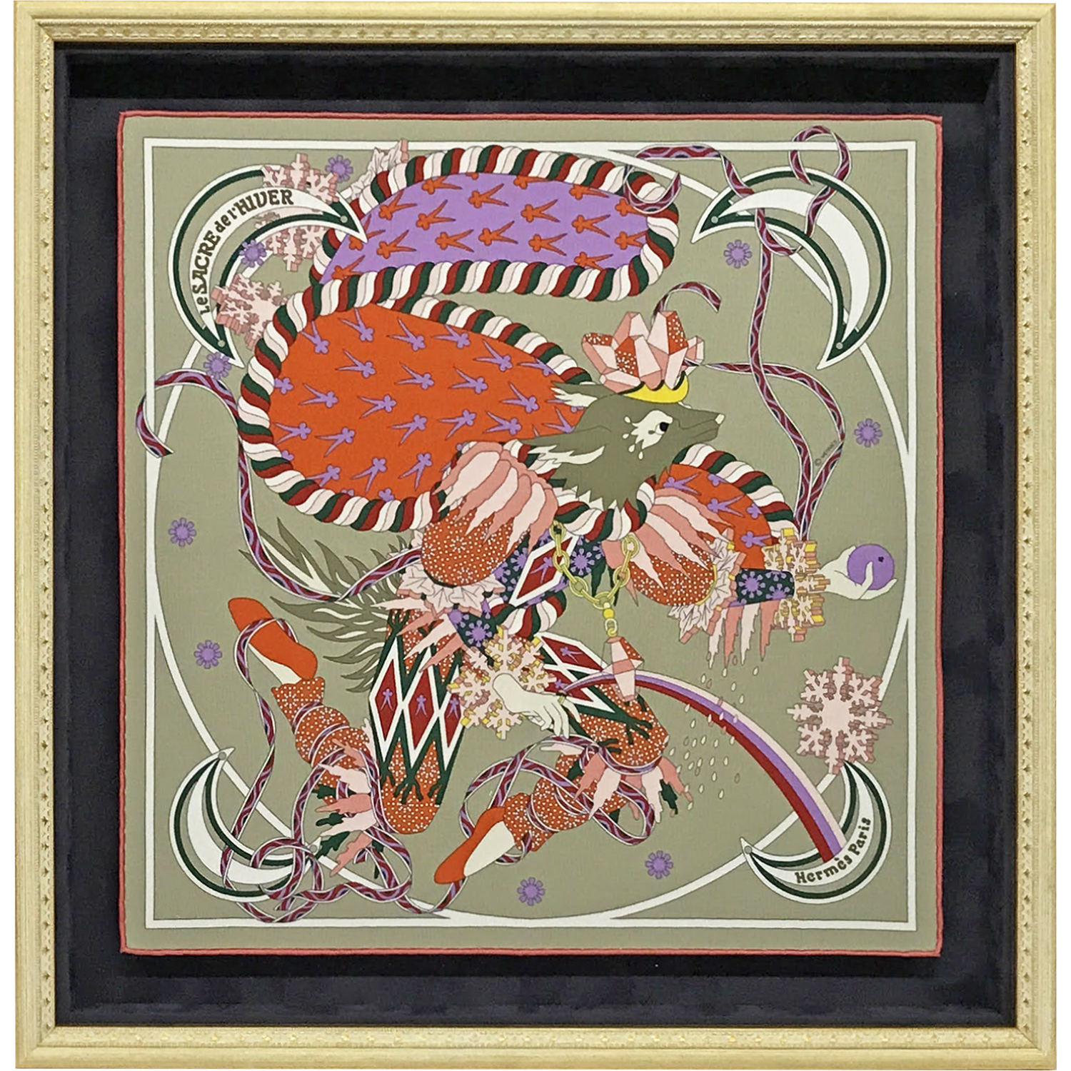 45センチ程度のエルメスのスカーフ「Le Sacre de l’Hiver 冬の祭典」を浮かし額装にしました。こちらは周囲のかがり縫いされた部分まですべて見せる額装方法です。軽やかに跳ね飛ぶデザインも相まって、躍動感もある仕上がりになりました。