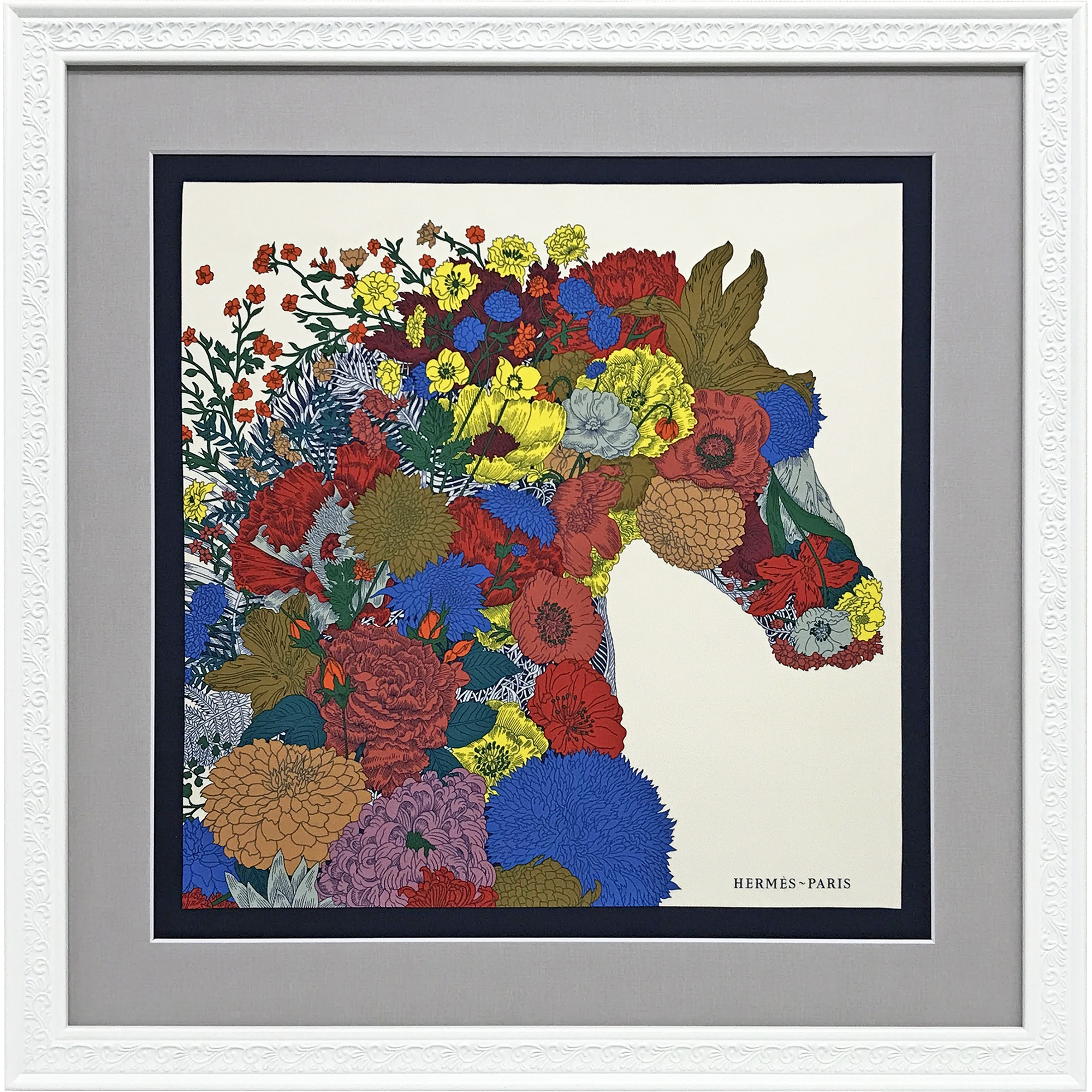 デザイナーのTheo de Gueltzl氏によるエルメスのカレ「ローブ・レジェール・デタイユ」をマット付きで額装しました。カラフルな草花の馬をホワイトのフレームで額装することで、スカーフの色合いを引き立てています。