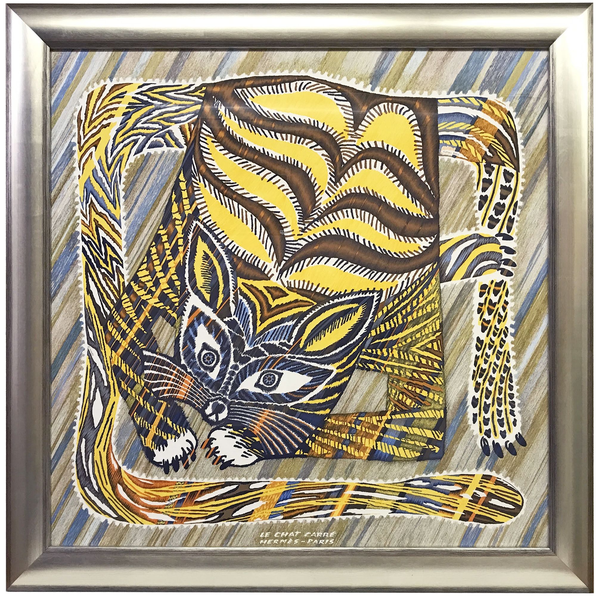 エルメスの「ル・シャ・カレ」を額装しました。カラフルながら、落ち着いた色合いでアートっぽく猫が描かれている見事なデザインです。額装することでよりデザインが際立ちました。