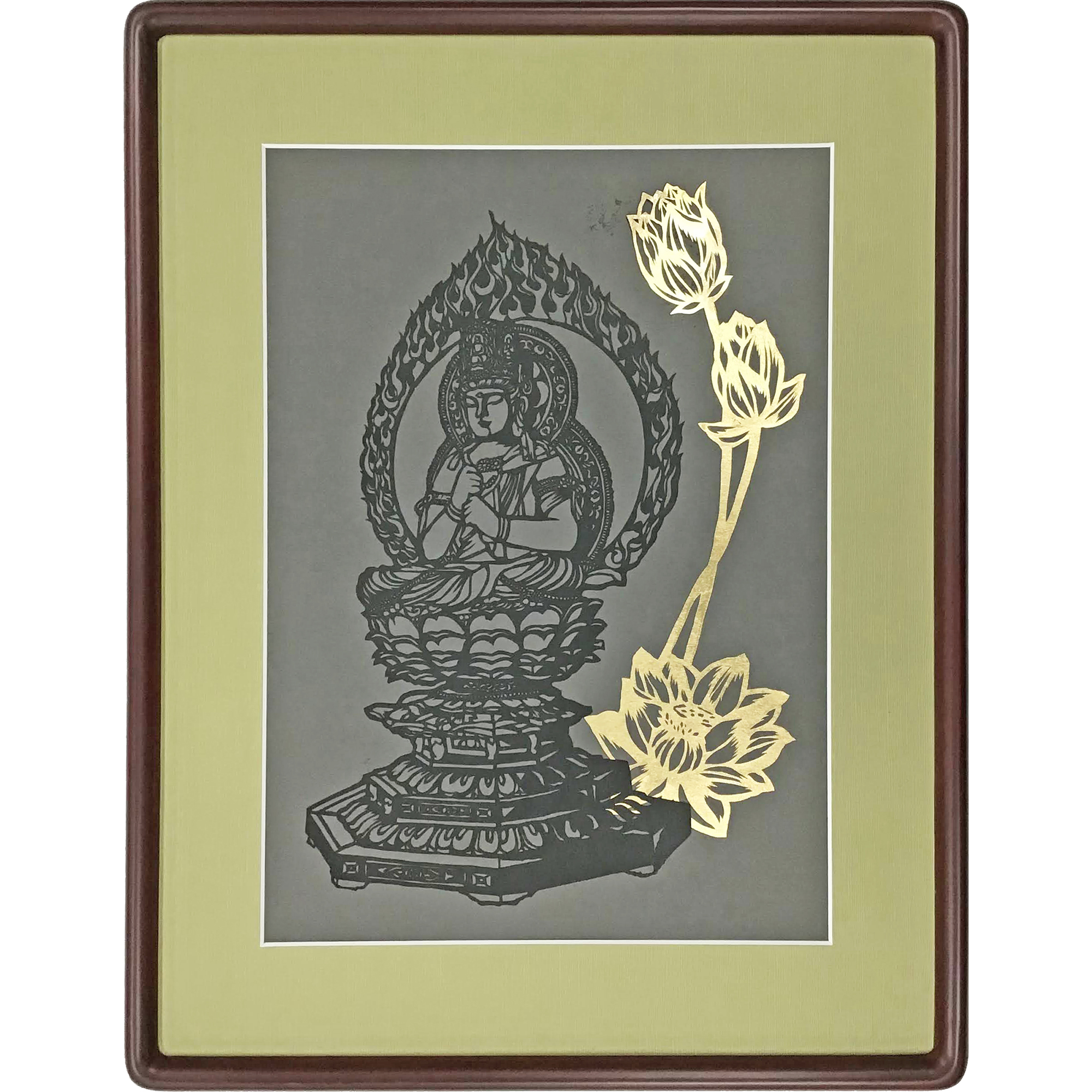 仏像がモチーフの切絵を額装しました。仏様の穏やかな表情や台座の緻密な意匠まで丁寧に切り抜かれており、脇には金色の蓮の花が添えられています。