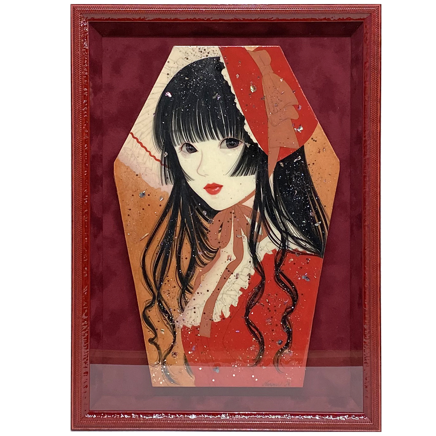 画家の細川成美氏が描いた、赤い服を身にまとった少女の絵を浮かし額装にしました。六角形の作品の端を隠さずに全てを見せる仕上がりです。