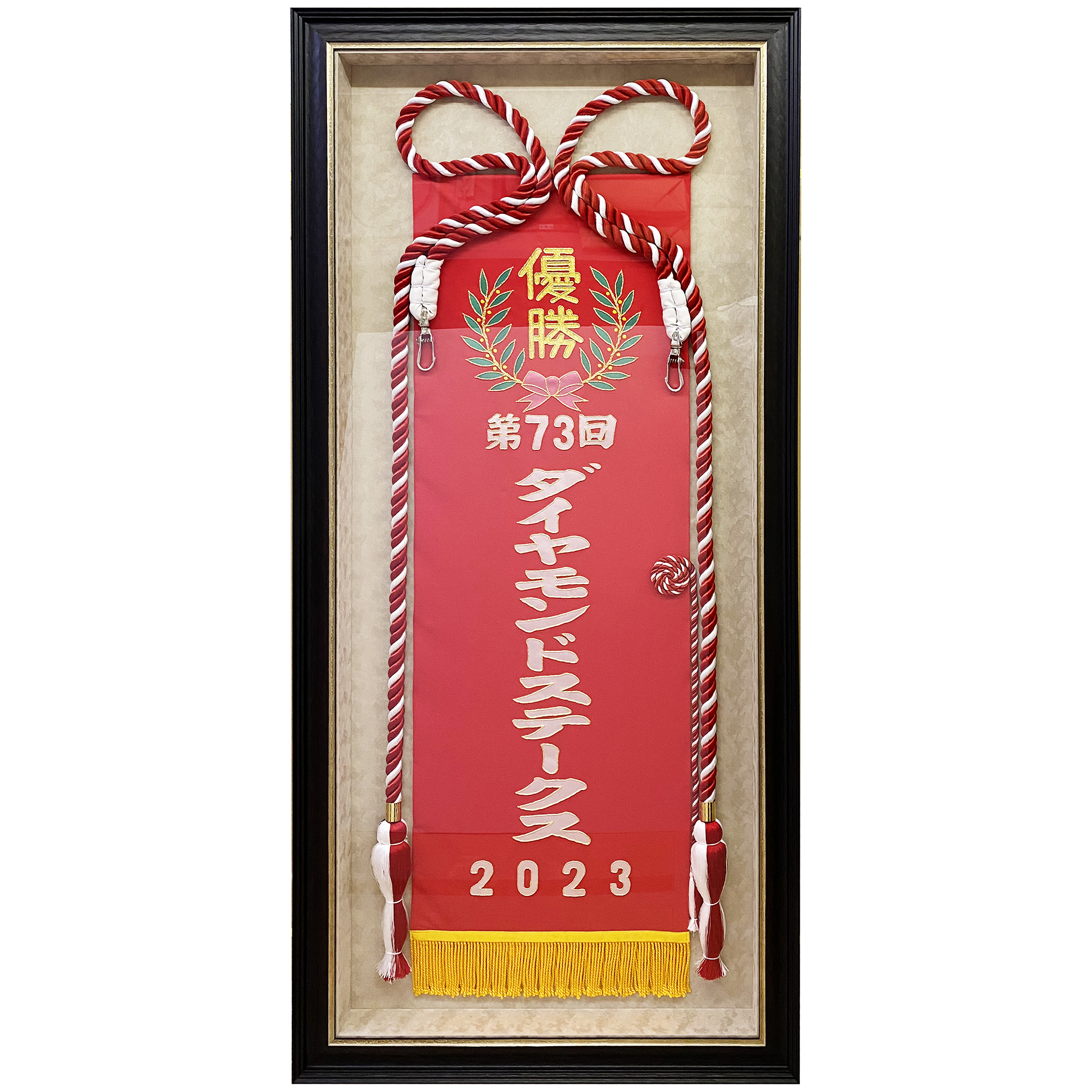 ダイヤモンドステークス(G3)を制したミクソロジー(西村淳也)号の、優勝記念の肩掛けと手綱の額装です。