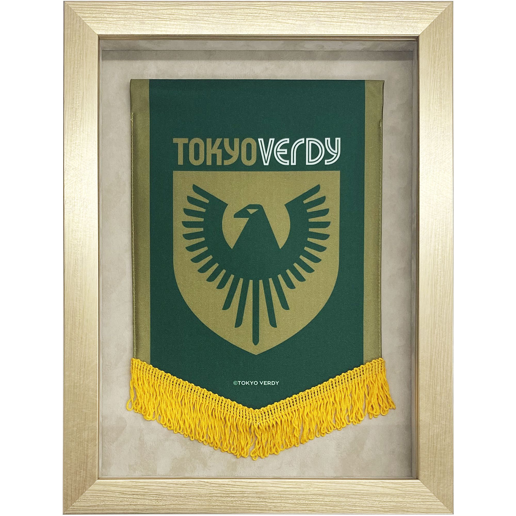 シンプルで上品なゴールドのフレームに、ベージュ系のスエードマットを合わせました。上品で控えめなコーディネイトが、東京ヴェルディの洗練されたペナントを引き立てています。