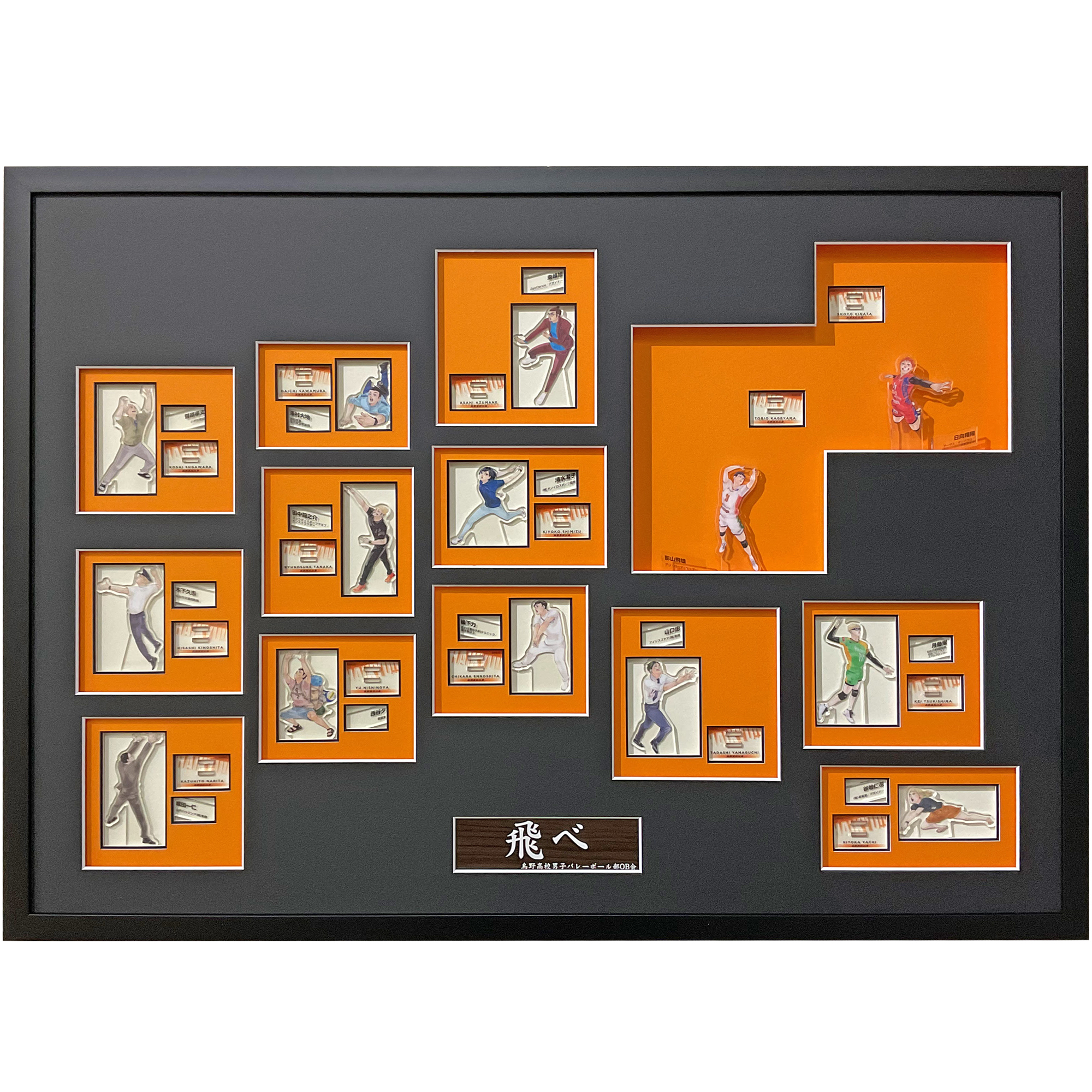 他のメンバーは、一人一人がしっかりと見えるように縁取りをしてさらに囲んでみました。日向影山コンビだけ奥行きがあるのも全体バランスが悪いのでところどころ浮かしをいれて影ができるようにしています。どの角度から覗き込んでも楽しめるように見えない部分もオレンジマットを貼っています。アクリルスタンド額装は、影を楽しめるので活かさないともったいないですよね。照明の具合で楽しさ倍増に!また、烏野高校の横断幕をイメージしてプレートも作成。横断幕があることで全体のバランスが引き締まる仕上がりになりました。・イメージカラー