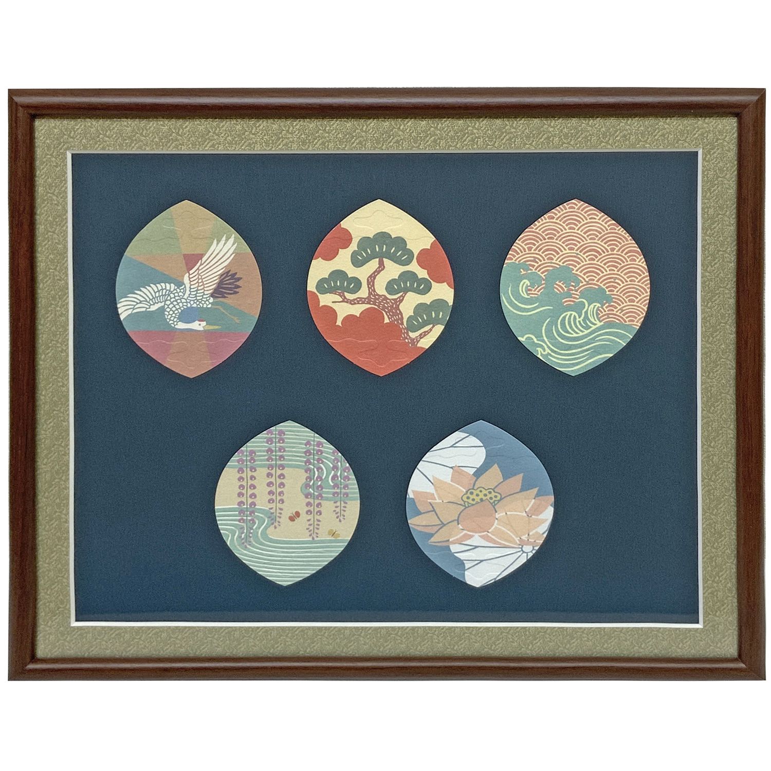 かまぼこ型の柔らかな曲線を持つ額縁を選びました。華葩の間には適正な余白を確保しつつ、額縁サイズが大きくなりすぎないように配慮しています。フレーム内側に置いた紙どんすのマットと、背景となる紺色のマットで華葩が際立つ額装になりました。フレームの丸みと落ち着いた色調が、散華の繊細な意匠と調和し、全体として品格ある佇まいを感じさせます。
