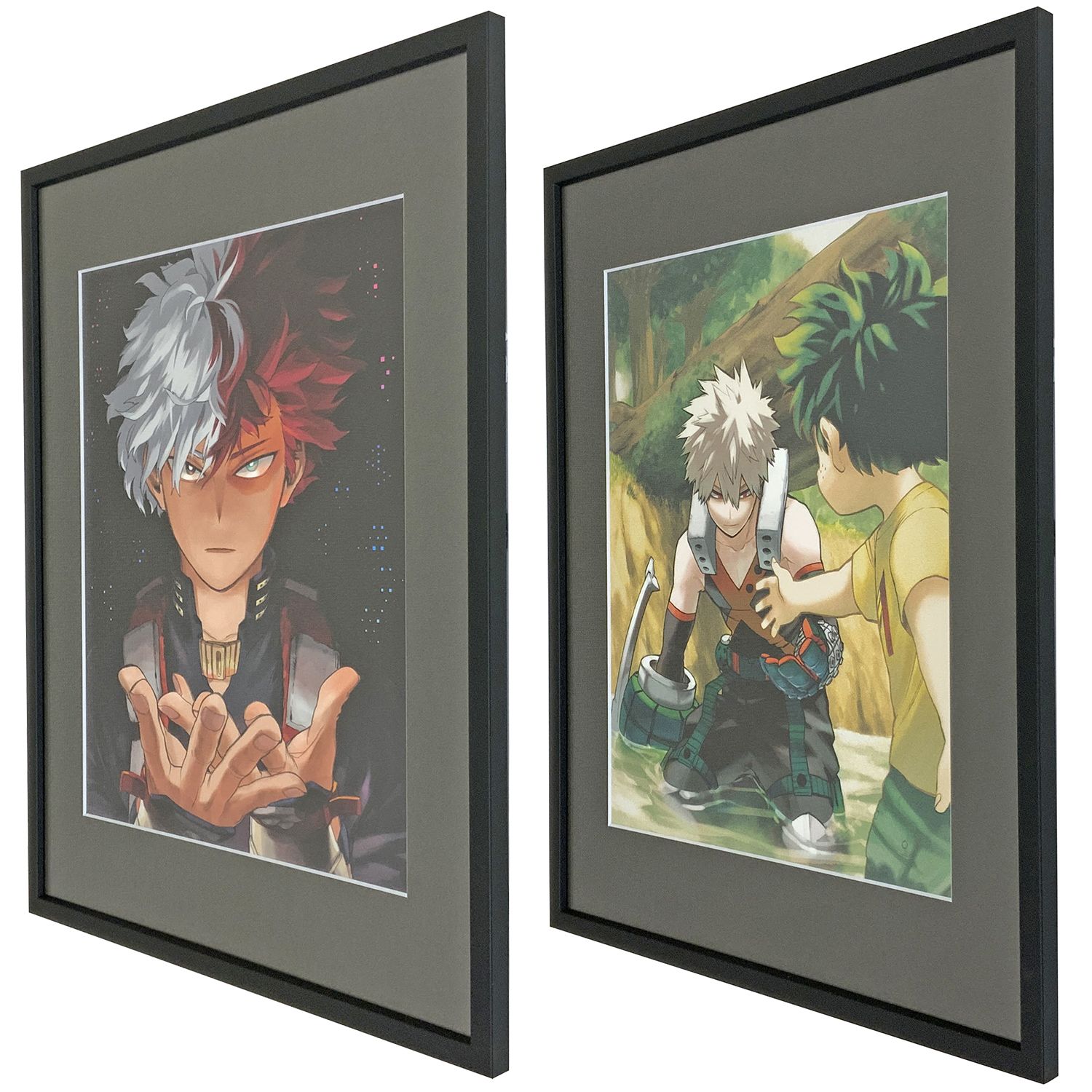 集英社コミックカレンダー2022「僕のヒーローアカデミア」の2枚を額装しました。「ジャンプGIGA2021 SPRING」の表紙で使用された轟くんのワンショット、爆豪勝己:ライジング回が収録されたコミックス29巻の表紙の絵柄の2枚です。