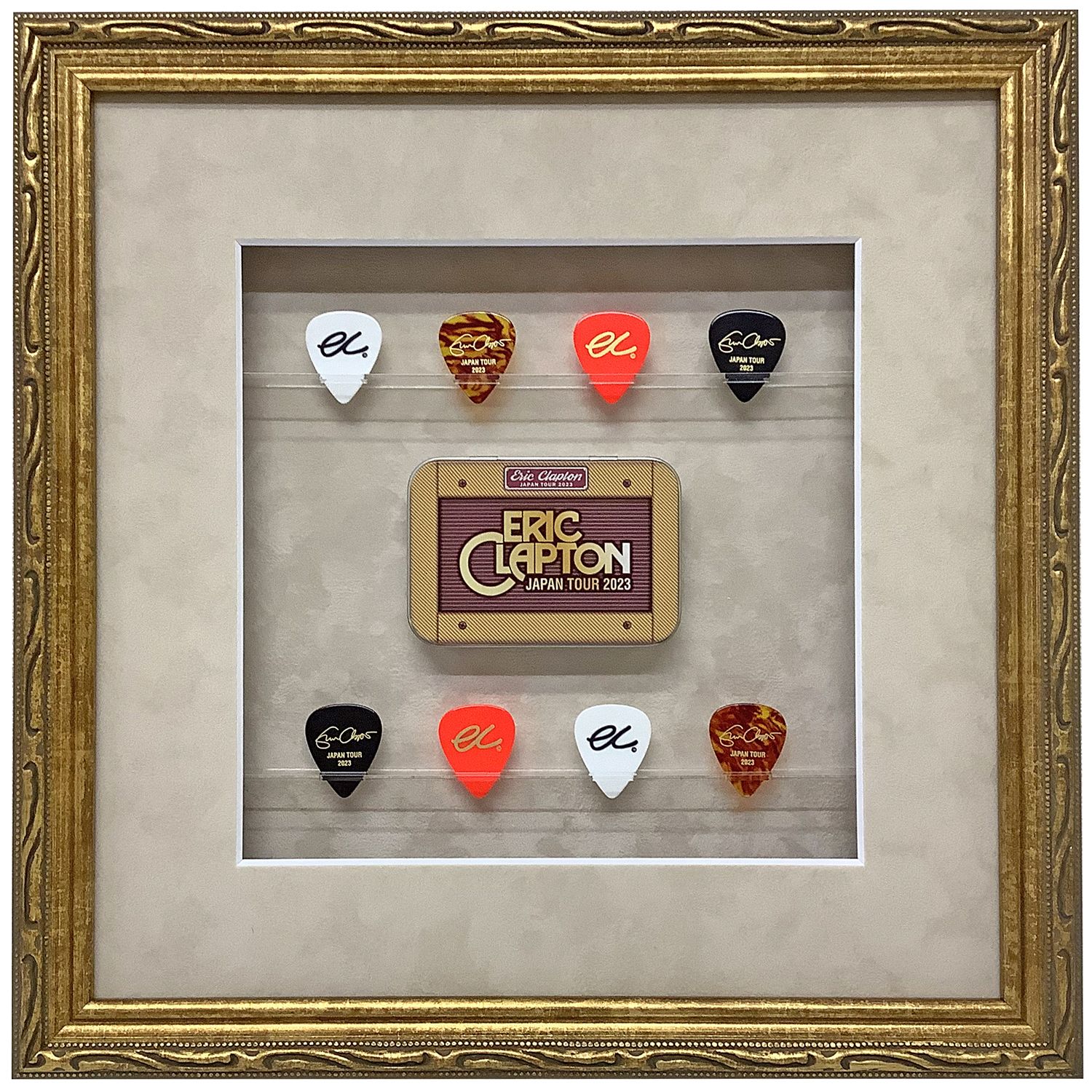 「ERIC CLAPTON JAPAN TOUR 2023」のツアーグッズ。ギターピック8種類が入ったギターアンプデザインの缶ケースの額装です。 ギターピック8種類を特製のアクリル棚に飾りました。ヨコに渡したアクリル板に、ピックの先が挿さるスリットを開けてあります。挿し込んでいるだけなので、位置の入替も自在です。このままだと配送には耐えられないので、最終的な額縁へのセットはお客様にお願いしました。 さらに背景となるマットに貼り付けた磁石が磁力を発揮して、缶ケースをしっかり固定しています。強力な磁力を誇るネオジム磁石が安価に出回っていることもあり、磁石を使った額装も徐々に多くなってきました。アクリルに挿し込んだピックと同じく、取り外しが容易なのも大きなメリットです。もちろん、磁石が付く素材でないと意味がありませんが、なかなか融通の利く額装方法です。