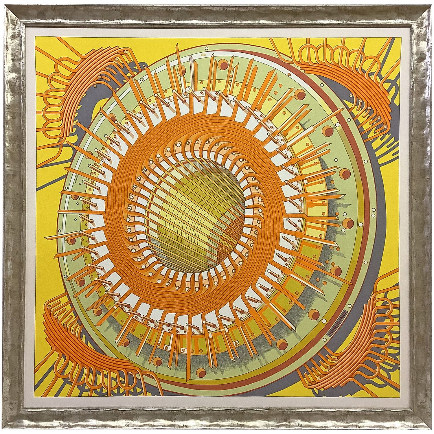 エルメスのダブルフェイススカーフ「オルタネーター」を額装いたしました。ダブルフェイススカーフはいわゆるリバーシブルになりますが、スカーフは専用パネルに張り込んで額装するため、片面は必ず見せられなくなります。今回は明るいオレンジの面を表としてパネルに張り込んでいます。