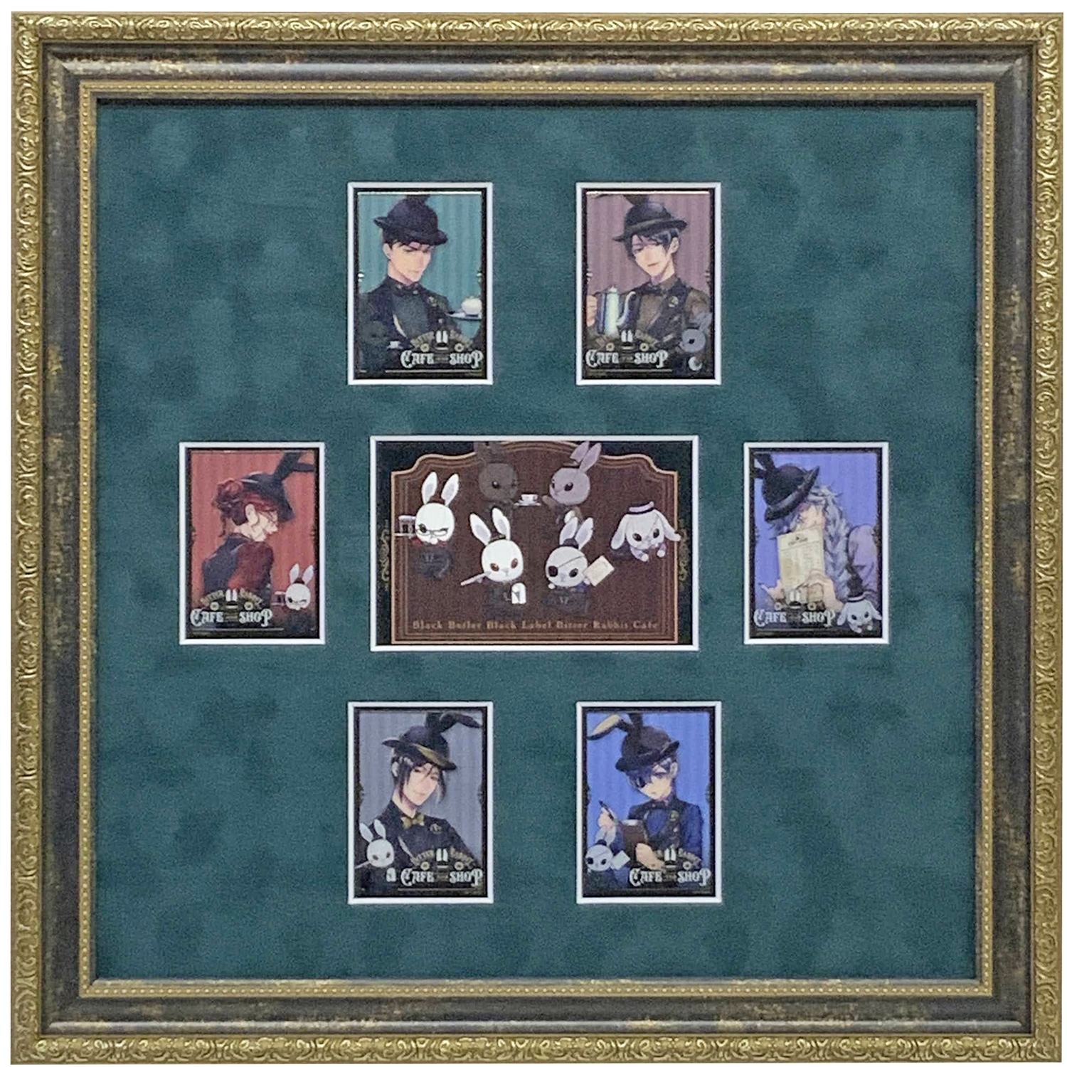 「黒執事」のビターラビットカフェ&ショップにて販売している「トレーディングクリアカード/ Cafe & Shop Edition」を額装しました。中央にはキャラクターモチーフのビターラビットが描かれたポストカードも一緒に飾っています。