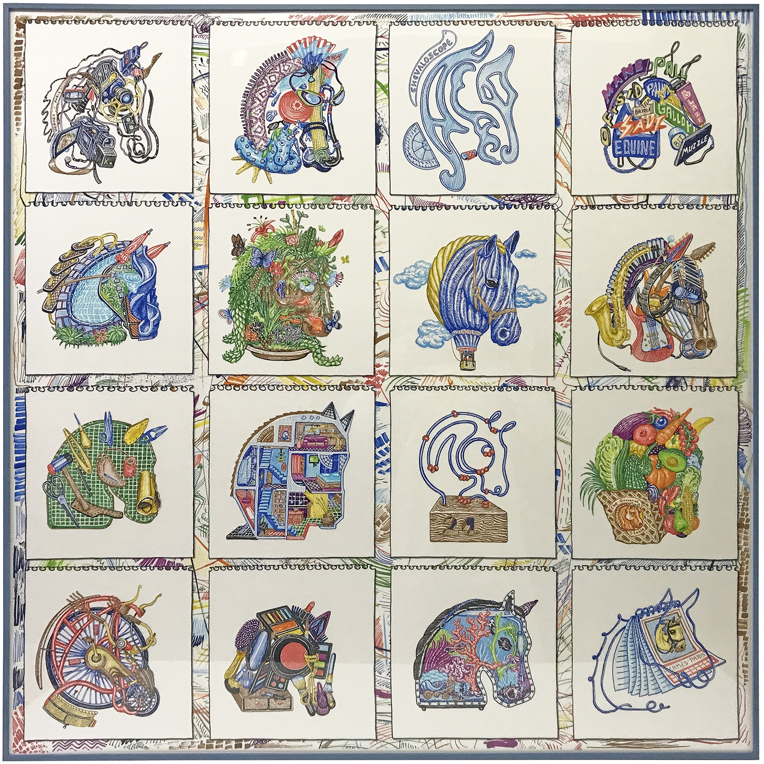 エルメスの「シュヴァロスコープ」を額装しました。様々な物を用いて、エルメスの象徴でもある馬を個性豊かに16頭表現しています。1頭1頭じっくりと見ると色んな発見がある、ワクワクするデザインです。