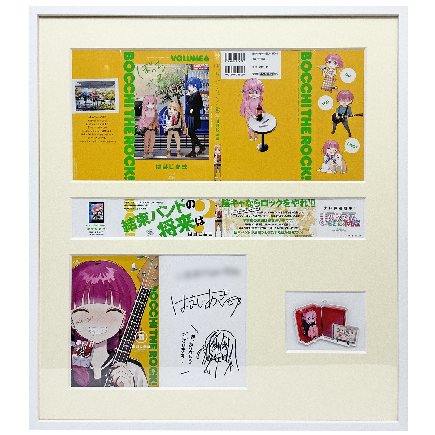 メインとなるサインをしっかり見せるのはもちろん、帯や表紙カバーを広げて飾ることで、通常であれば見えない折り返しの部分まで堪能することができます!背景マットをオフ白にすることで、アクリルキーホルダーも鮮やかに発色しました。