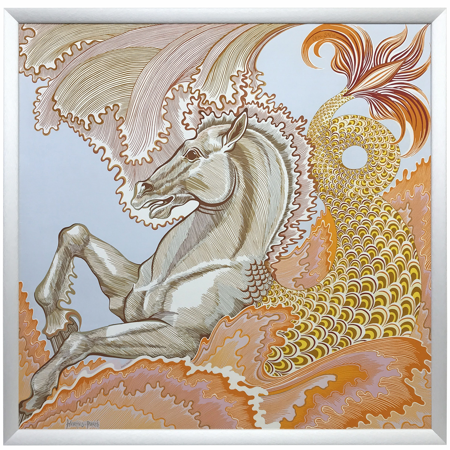 エルメスの90cmスカーフ「マーメイドホース」を額装しました。ダブルフェイスと呼ばれる、裏表両面にデザインの施されたリバーシブル仕様のスカーフ。不思議な馬の人魚(?)と波の躍動感に、力強さを感じるデザインです。