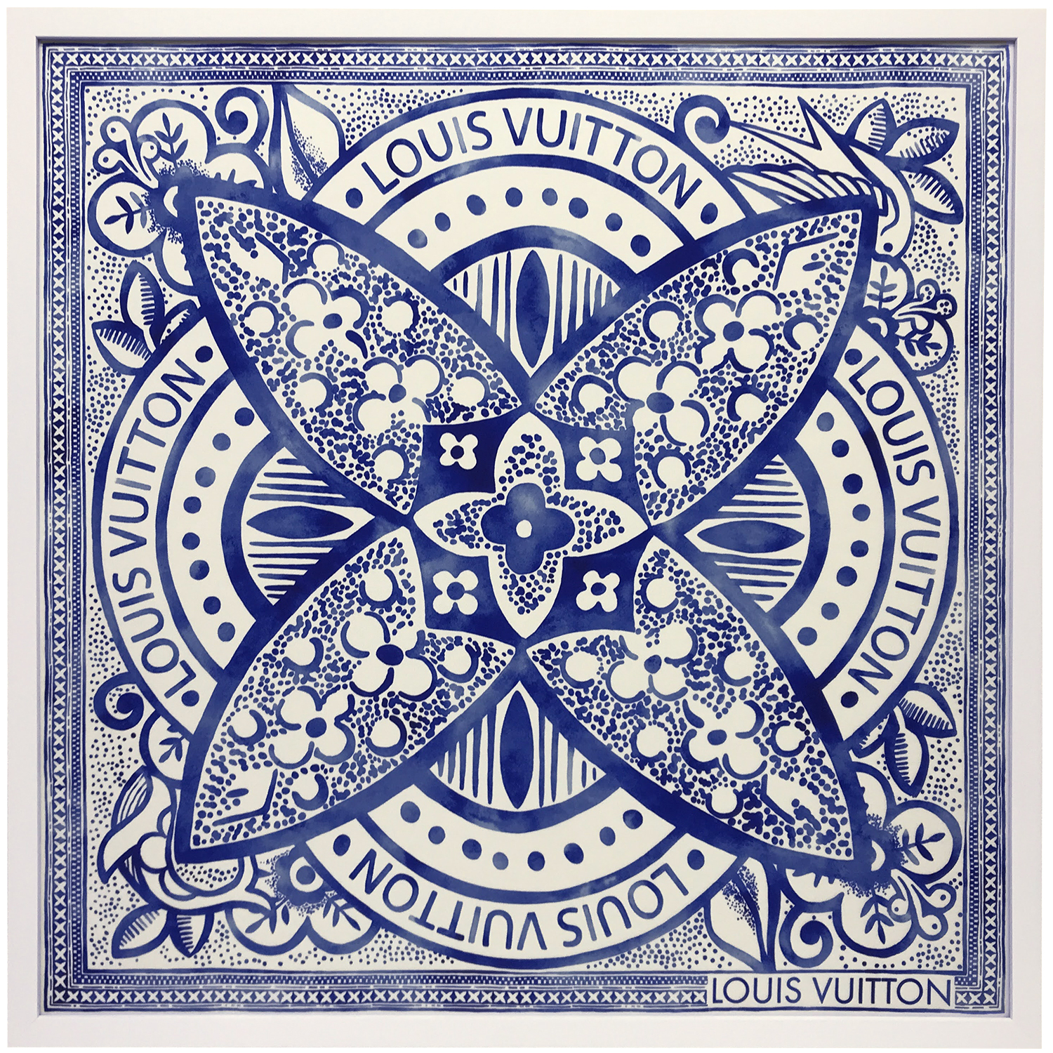 青と白で統一されたデザインが魅力的なルイヴィトンの70cmスカーフを額装しました。花や葉のモチーフが各所にちりばめられている繊細なデザインが魅力的で額装品のインテリアとしてもぴったりです。