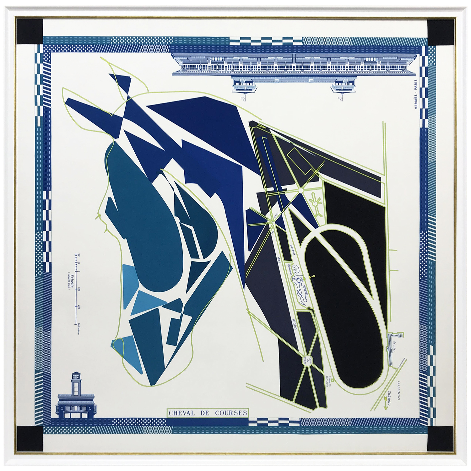 フランス語で競走馬を表す「CHEVAL DE COURSES」と題されたスカーフを額装しました。馬の横顔を描いたスカーフですが、よく見ると競馬場のコースらしきデザインが。これは恐らく、フランスの「シャンティイ競馬場」をモチーフにしたものではないかと思われます。シャンティイ競馬場では、エルメスがスポンサーを務めるレースも開催されていたようです。抽象的な馬の横顔に競馬場のデザインが溶け込んで見える、秀逸なデザインのスカーフです。