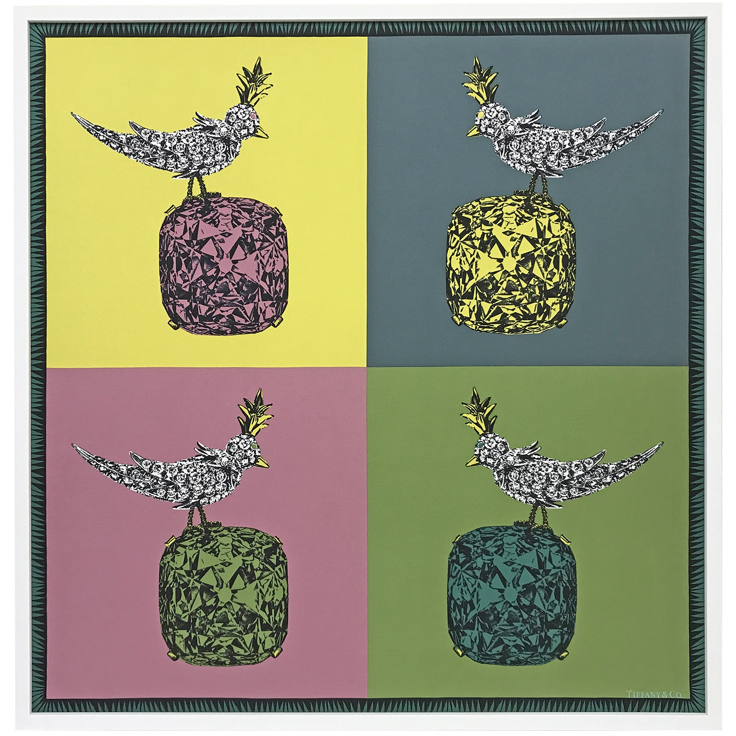 ティファニーのブローチデザインとして代表的なアイコンである「バード オン ア ロック」があしらわれたスカーフを額装しました。アイコニックなモチーフがポップアート風にパターンとして描かれており、見ていると明るい気持ちになります。