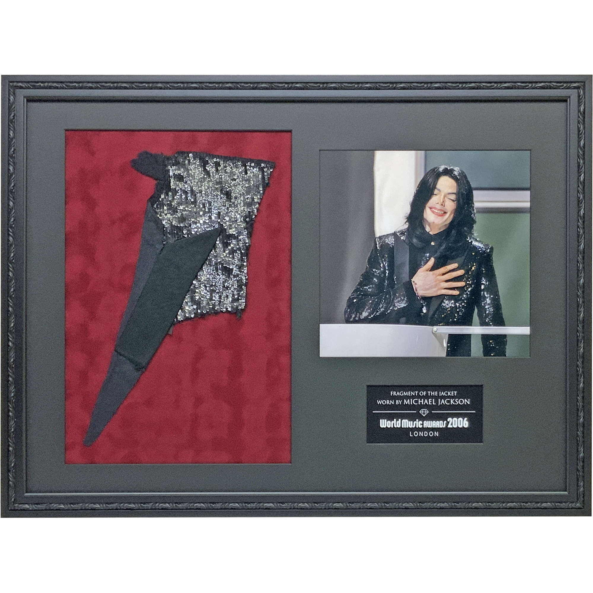 ワールドミュージックアワードでのスピーチで、マイケルはファンへの深い愛と感謝の気持ちを表現し、象徴的な黒いジャケットを観客に投げてステージを去りました。こちらの額装品は、まさにマイケルが着用していたステージ衣装の一部です。