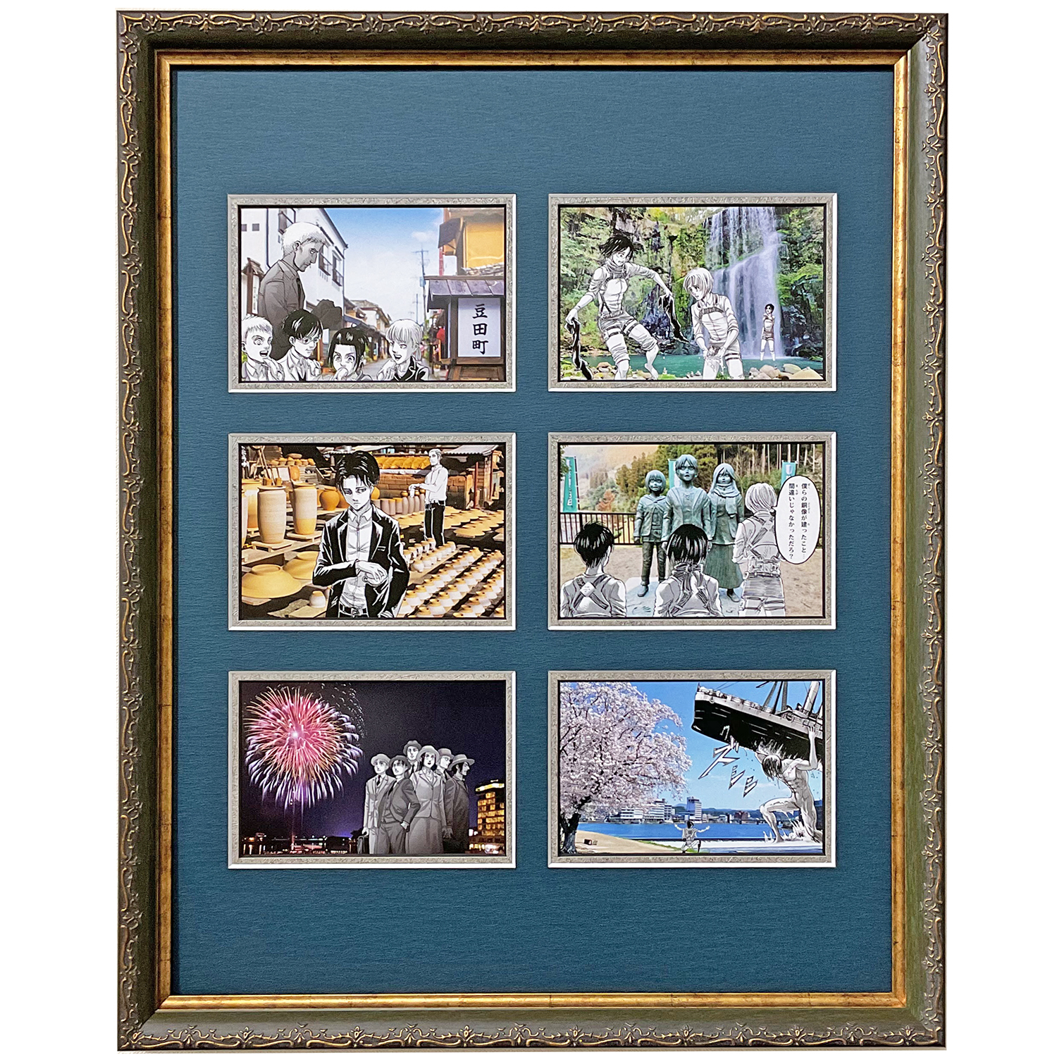 進撃の日田コラボ!「進撃の巨人」作者の諫山先生の故郷、大分県日田市の各観光地にキャラクターたちが訪れている「観光ポストカード」の額装です。もとのポストカードは蛇腹状になって繋がっていますが、切り分けて複数窓抜きしたマットと組み合わせました。