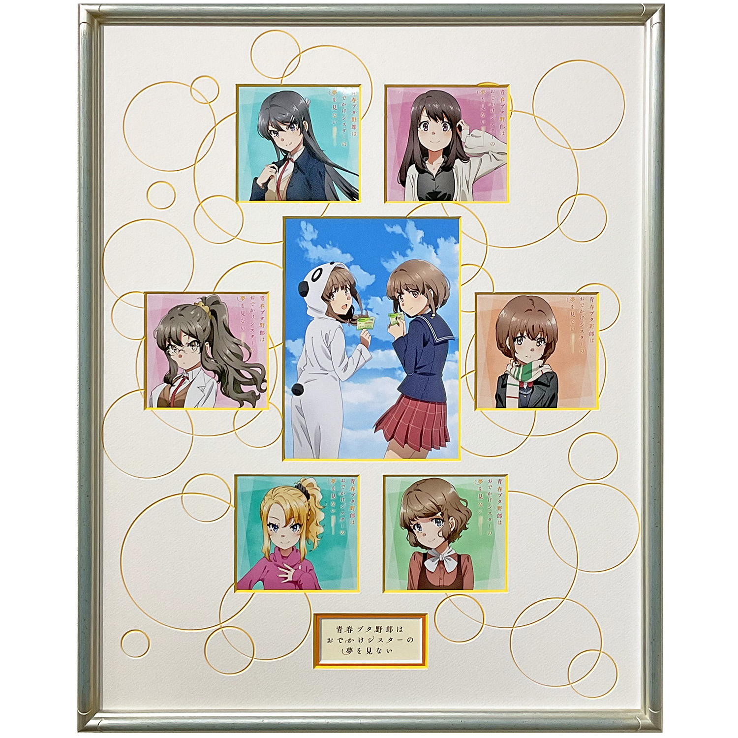 青ブタシリーズ「青春ブタ野郎はおでかけシスターの夢を見ない」DVD特典イラストとステッカーの額装です。お客様にはフレームだけ選んでいただき、マットの色や配置デザイン全ておまかせでのご注文を承りました。