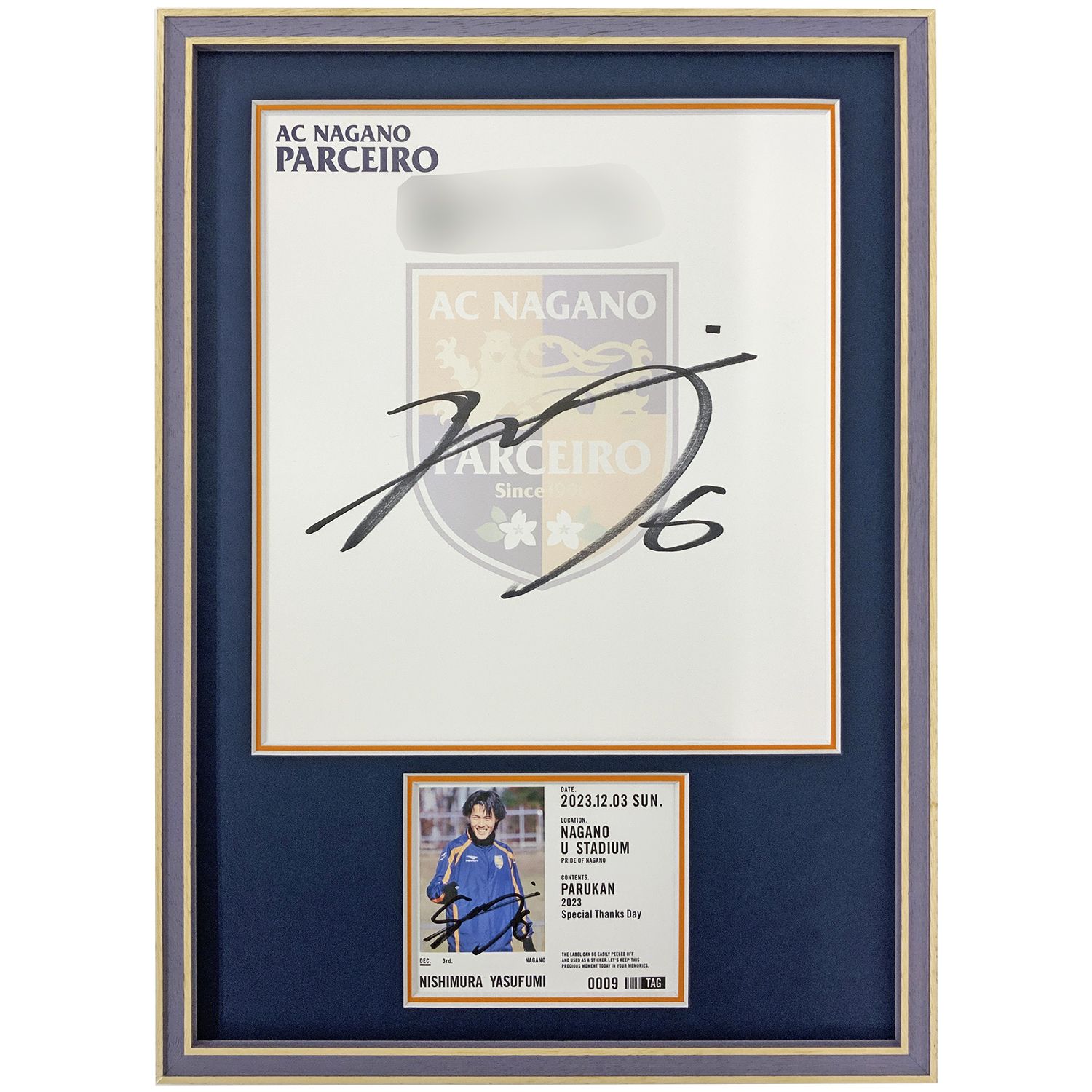 長野県を中心に活動するサッカーチーム、長野パルセイロ所属の西村恭史選手のサイン入り色紙とラベルステッカーを額装しました。