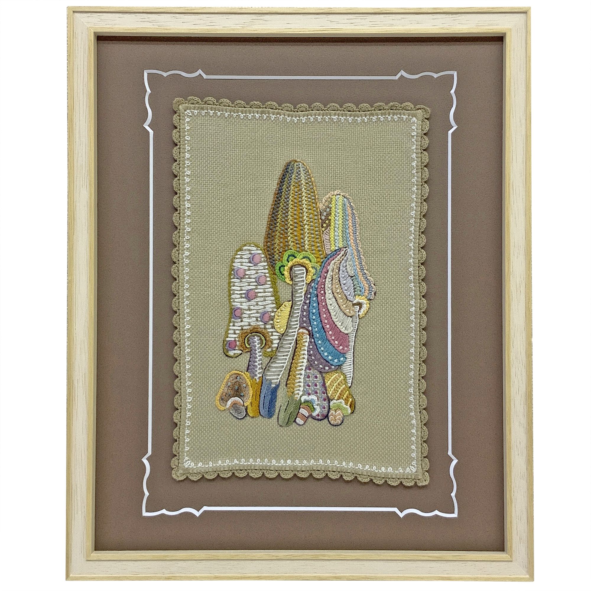 かわいらしいキノコの刺しゅう作品。クロスステッチなどは通常、裏打ちを行い、刺しゅうの施されている部分のみを見せる形で額装しますが、今回は土台の布地そのものの形を活かせる方法で額装しました。土台のマットに直接両面テープで張り込んでいるので、マットを被せる必要がありません。その分作品よりも一回り大きく窓抜きしたマットを合わせ、作品の周囲にデザイン性を持たせています。布地周囲の歪みが若干残ってしまってはいますが、作品の良さを最大限生かした額装ができました。