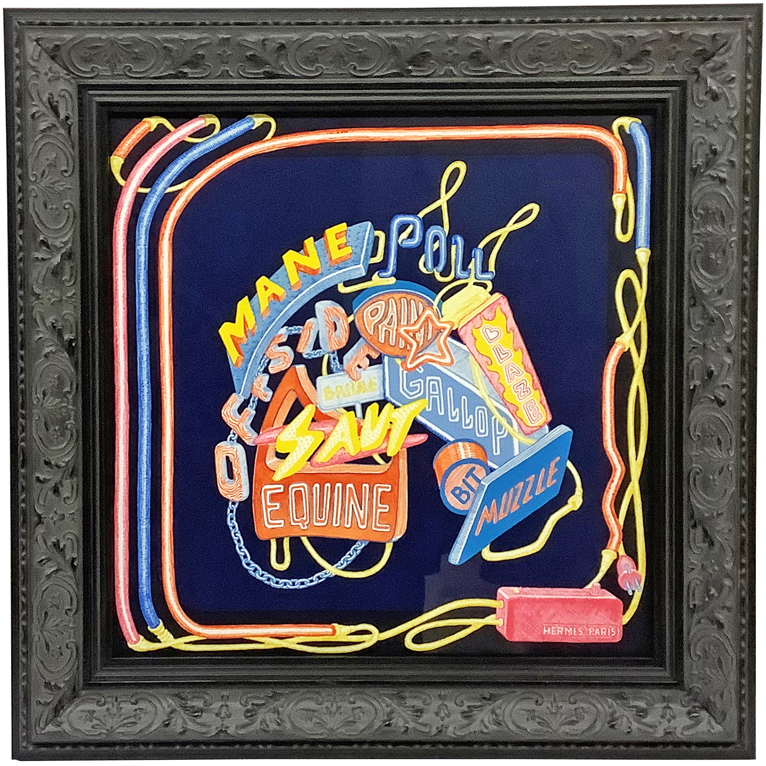 カレ45 ガヴロッシュ「シュヴァロスコープ・ネオン」の額装です。エルメスのスカーフ「シュヴァロスコープ」は、個性的な16種類のテーマでデザインされた馬の横顔が特徴的なシリーズです。今回はネオンをモチーフにデザインされたものを額装しました。アンティーク調のフレームと組み合わせることで、1枚の絵画のような仕上がりになりました。