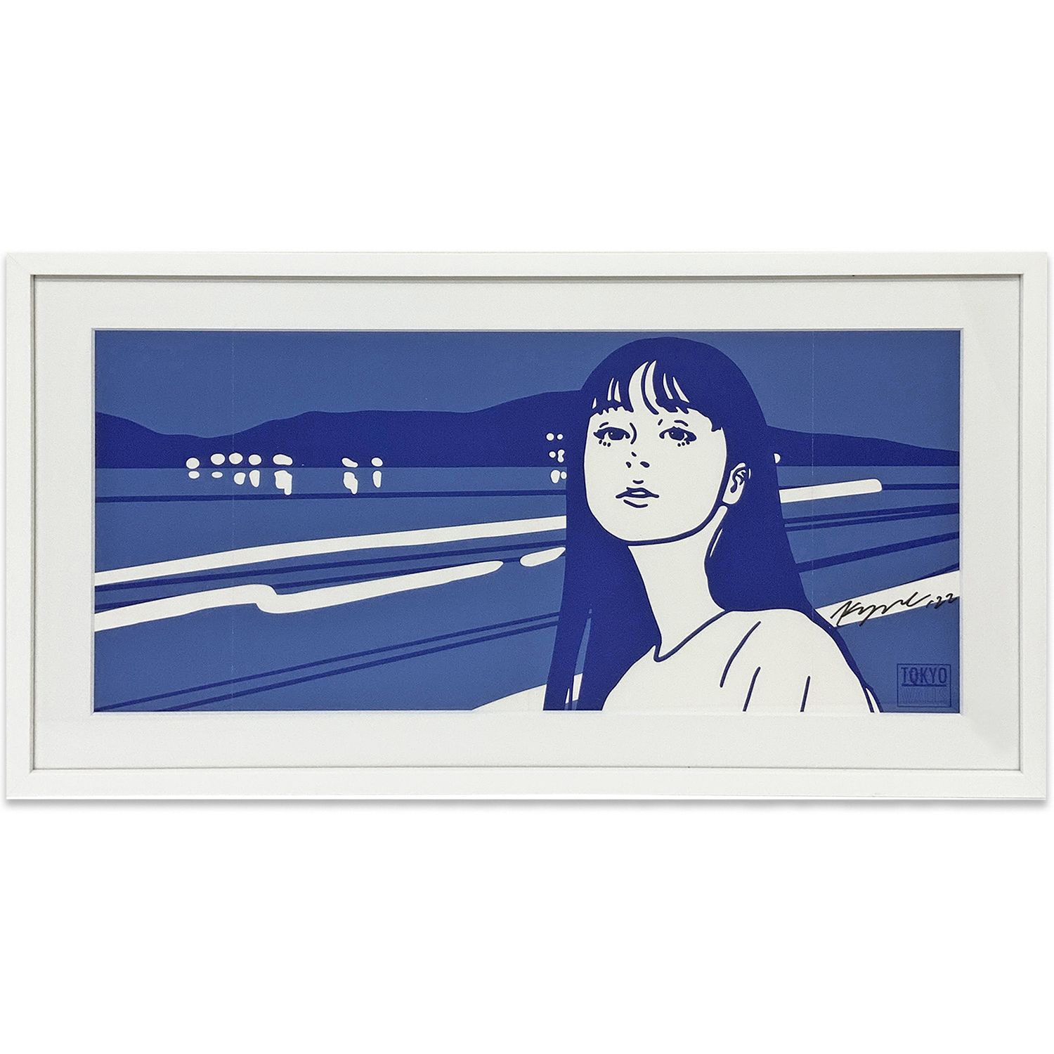本から外した表紙を薄めのボードに貼り込み、たるみや折れ目を正してから額装しました。和紙と違い、こういった洋紙についた折れ目は平らにしても跡が残ってしまいます。背表紙の軽い折れ目はほとんどわからなくなりましたが、内側に折り返された両側には、折れ目の跡が目に付きます。表紙としての面影を残していると割り切って、ピシッと平坦になったアートを楽しみましょう。平面的でモノクロの線画を活かした「KYNE-girl」には、シンプルな額縁がよく合います。こちらの額装例でも、木目を塗りつぶされたホワイトのフレームと、プレーンな質感のホワイトマットを合わせました。
