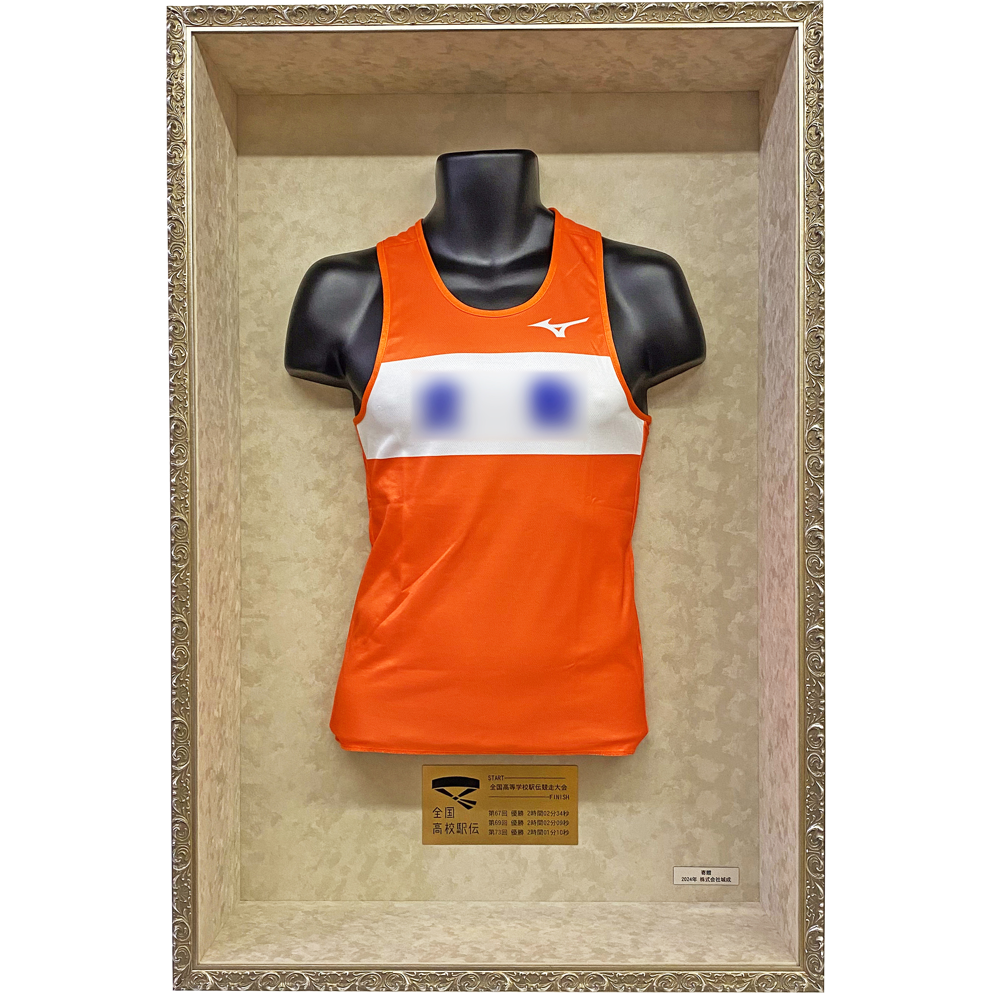 中にトルソーを固定した、なかなか斬新な額装です。リアリティ溢れる、高校駅伝のユニフォームの額装になりました。