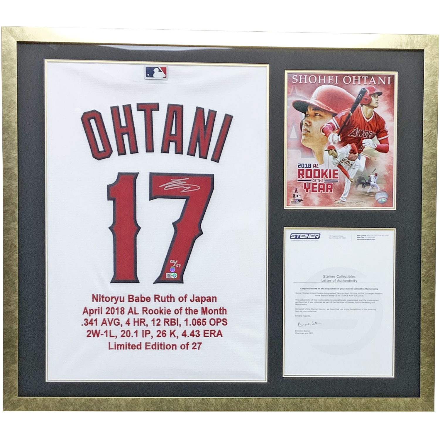 メジャーリーグで活躍する二刀流プレイヤー、ご存じ大谷翔平選手のメモラビリアです。2018年アメリカンリーグ新人王に輝いた彼の功績を讃える、サイン入りユニフォームと写真、そして真正証明書を一つのフレームに収めました。ユニフォームの背番号「17」の下には、2018年4月の月間成績が記されており、打者・投手両面での目を見張る活躍が記されています。