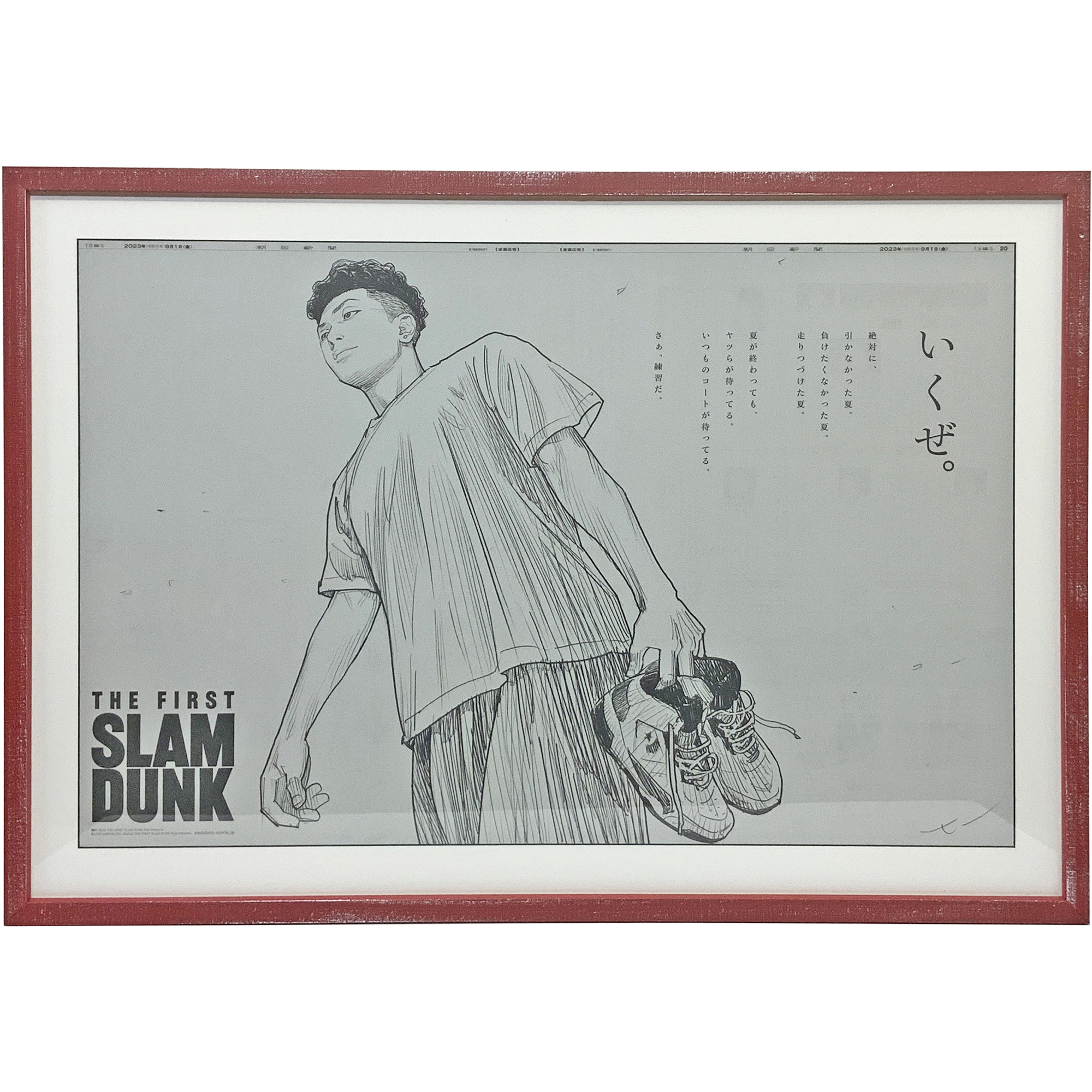 2022年12月3日に公開の「THE FIRST SLAM DUNK」、公開から2日間で興行収入が約13億円、公開67日で興行収入100億円、7月31日には興行収入が150億円を突破した大ヒット映画です。 こちらの額装品は、2023年8月31日の終映の翌日、朝日新聞に掲載された全面広告。井上雄彦先生が書き下ろした宮城リョータと「いくぜ。」の言葉が印象的です。大ヒットの感謝、映画の余韻、次回作への期待、、、混じり合った色々なおもいが溢れてきます。 額縁のタカハシが誇る新聞額装の技術を駆使して額縁に飾りました。湘北高校の赤をイメージした、ざらついた質感、アンティークっぽさのある赤が良く似合っています。エッジ面が黒になるホワイトマットと合わせることで、少しばかりの緊張感が演出されているのがポイントです。 映画の感動をいつまでも感じられるように、そして次回作への期待を胸に、日々の生活に彩りを添える一品となるでしょう。映画の余韻を楽しみながら、次回作への期待を膨らませることができる特別なアイテムになりました。