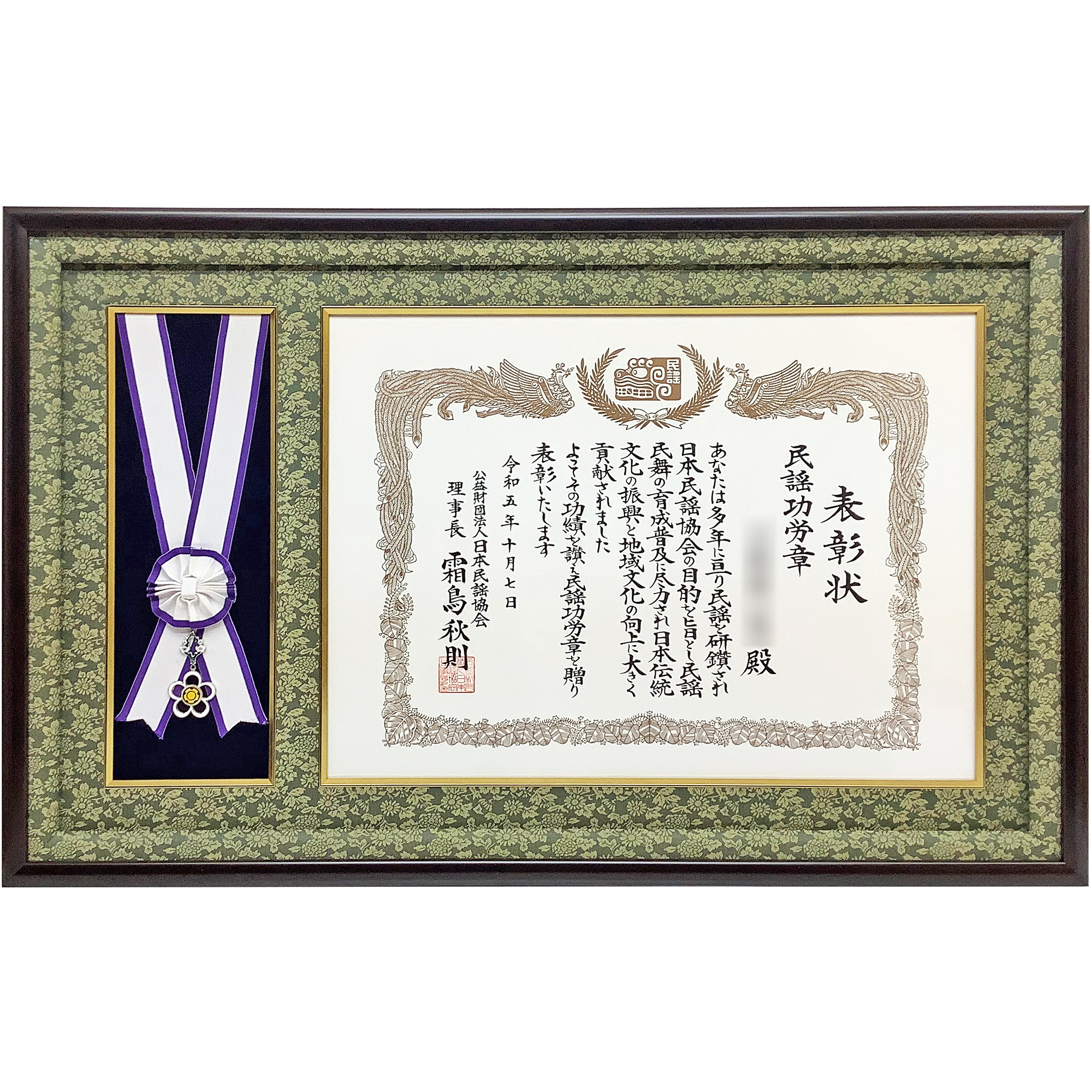 日本民謡の研究と普及に長年尽力された方への敬意を込めた民謡功労章。表彰状には公益財団法人日本民謡協会からの感謝の言葉が記されており、民謡文化の継承と発展に貢献された功績が讃えられています。章には紫と白のリボンがあしらわれ、花型のエンブレムとチャームが品格を添えています。