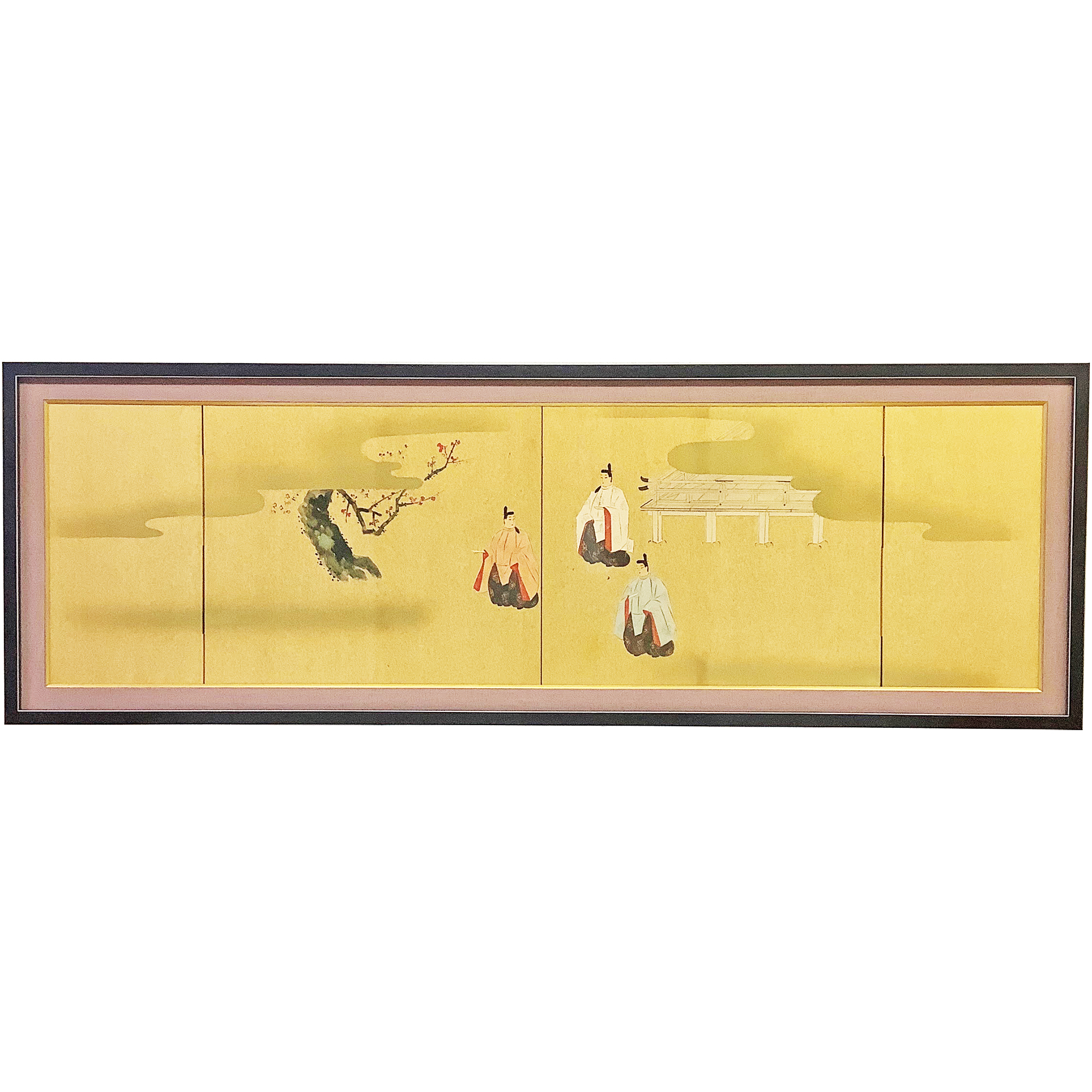 リフォームの過程で偶然発見された50年ほど前の屏風絵。額装によって新たな魅力が引き出されました。リフォーム後のお部屋に美しく調和し、趣のあるアクセントとなることでしょう。歴史を感じさせる屏風絵が、空間に深みと個性を加え、訪れる人々の目を楽しませることが期待されます。 額縁の構造はシンプルです。屏風は180度に開くことで平らな板のようになるので、屏風がちょうど収まるサイズの額縁を作成しました。さらに、屏風の周囲を隠す布貼りの特製マットも配置しています。マットの有り無しはお好みで決めて構いません。屏風の柄や色合いをより際立たせたい場合には、マットなしで額装するのも一つの選択肢です。 屏風は折り畳んで収納できるため、長い年月が経つうちに忘れ去られがちですが、偶然の再発見によってその価値が再認識されることもあります。そのまま置いて楽しむのも趣がありますが、スペースの確保が難しい場合には額縁によるディスプレイを検討するのも良いでしょう。額装することでお部屋のインテリアとして無理なく活用できるため、長く愛される一品となることでしょう。屏風絵に込められた歴史や美意識を大切にしながら、新しい空間でその魅力を存分に発揮させたいですね。