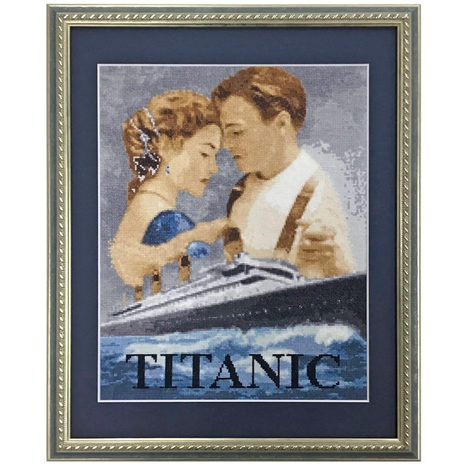 主役の二人と船体が大写しになった有名なレイアウトが、クロス刺繍のデザインになっています。全面が細かいクロスステッチで仕上げられており、写真を見ているような奥行を感じます。作品は多少歪みを矯正して、刺しゅう裏打ちを施して額装いたしました。